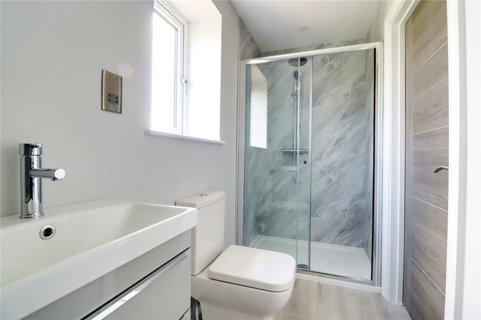 With three front facing uPVC double glazed windows, quality herringbone flooring with underfloor heating, inset ceiling spotlights and speaker.