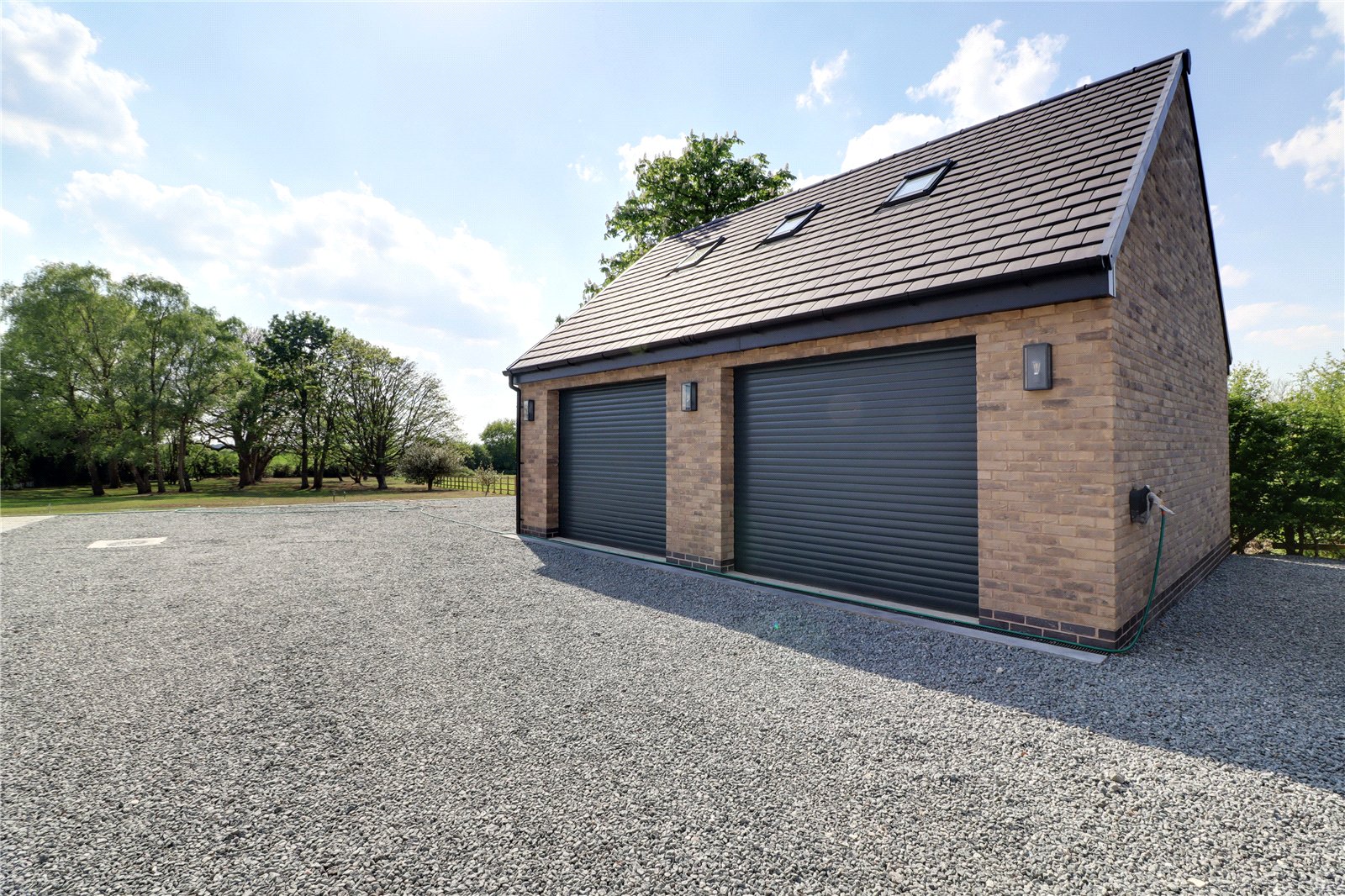 The property enjoys the benefit of a substantial brick and block built detached garage with twin remote operated electric roller doors, internal power and lighting, pitched roof providing storage with the option to convert if needed and a side composite entrance door.