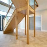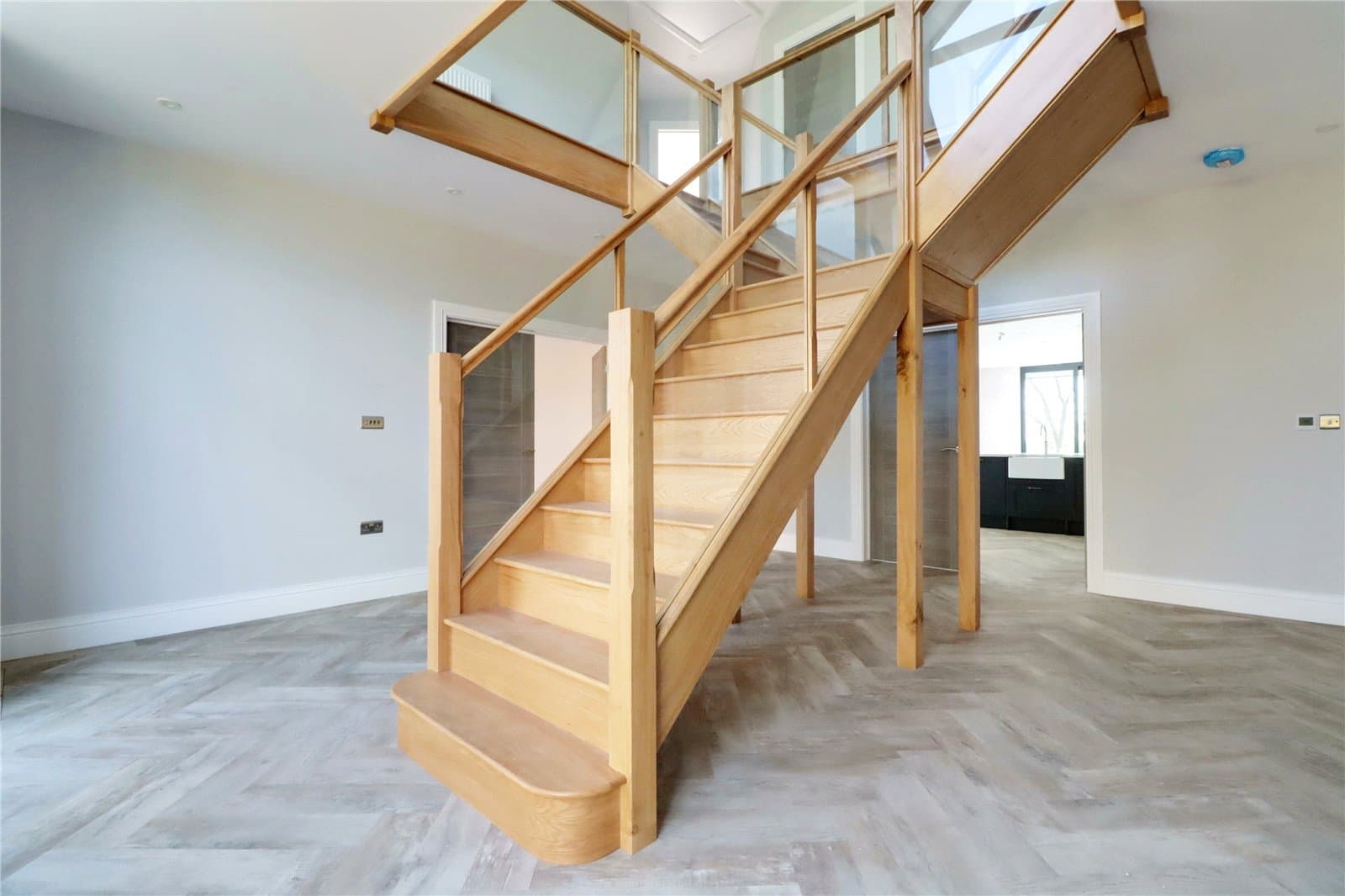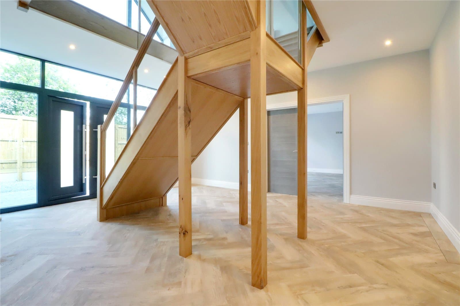 With stylish double glazed entrance door with frosted glazing with large brushed aluminium style pull handles and adjoining double glazed side and top light, feature herringbone flooring with underfloor heating, central oak staircase with glazed balustrading allowing access to the first floor, large built-in cloaks cupboard with shelving and inset ceiling spotlights.