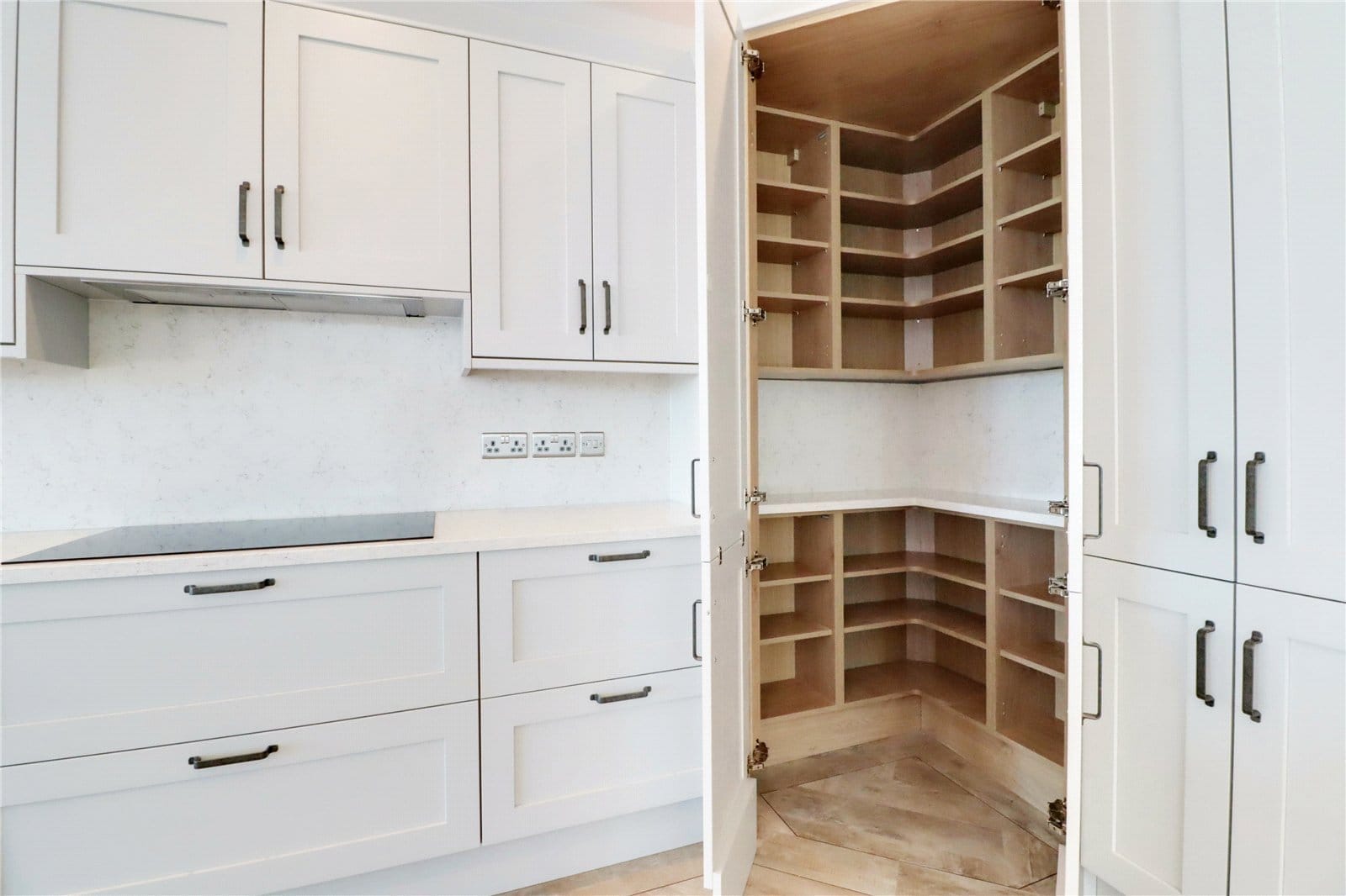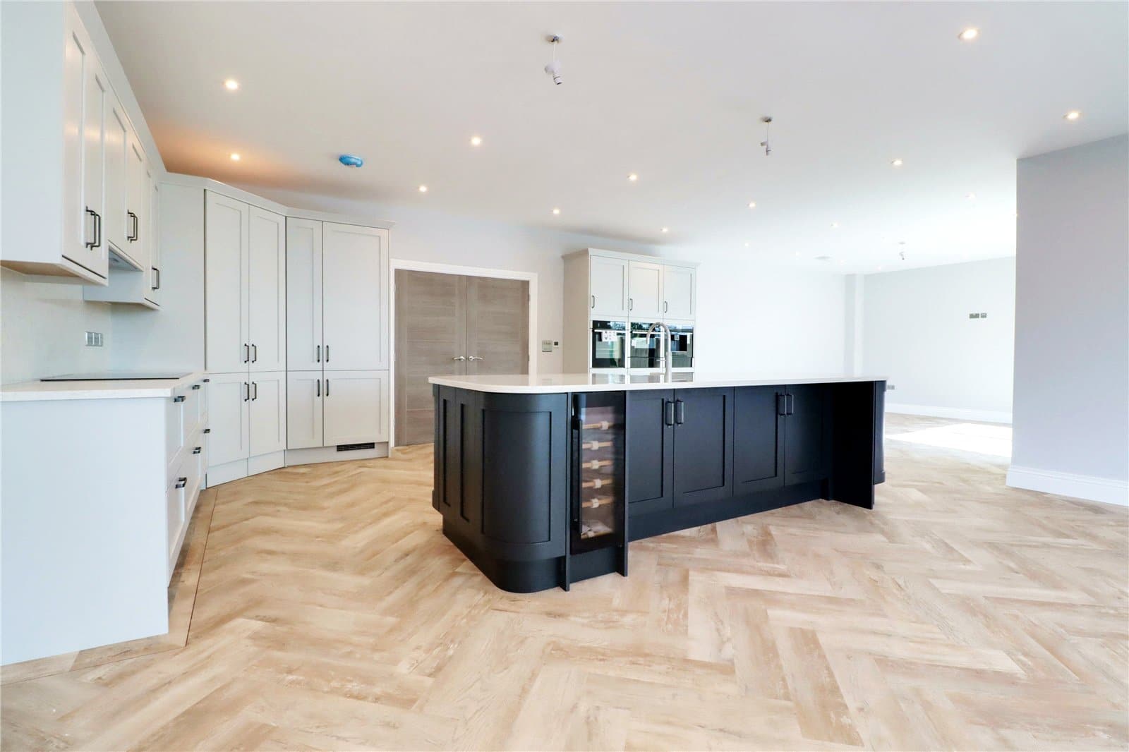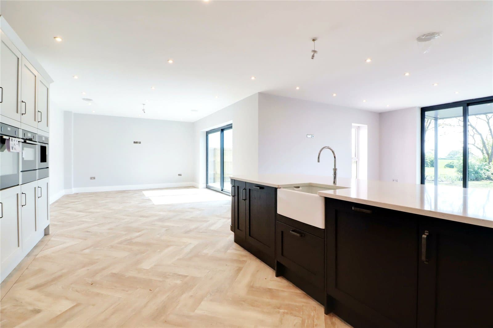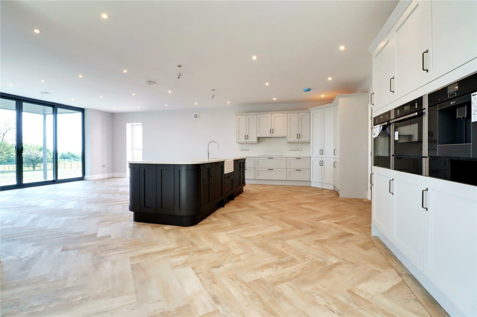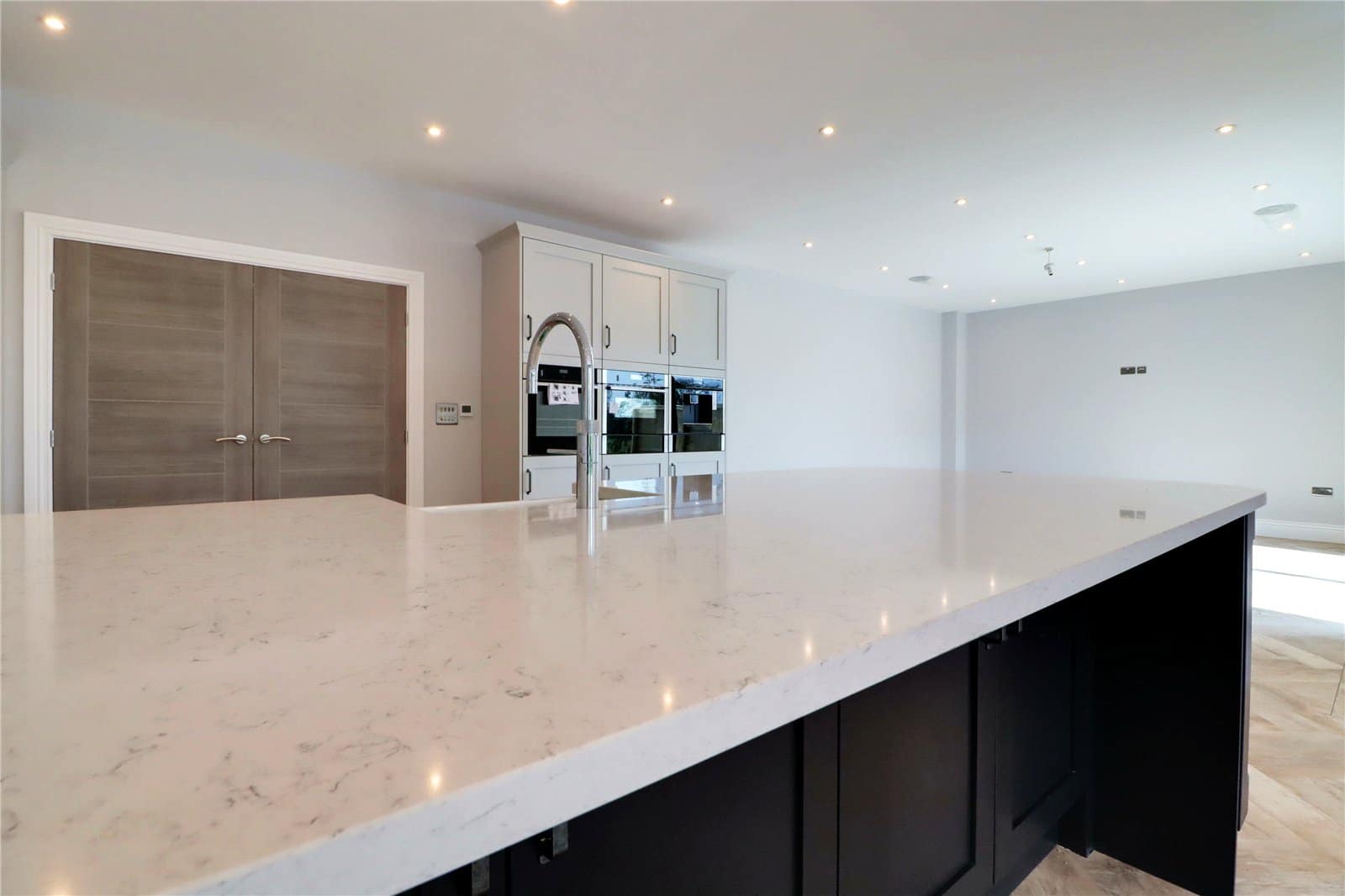 Having side uPVC double glazed windows and rear double glazed patio doors both allowing access to the garden. The kitchen enjoys an extensive range of quality fitted bespoke furniture of a shaker style with period style pull handles and a complementary quartz worktop with matching uprising, incorporating a Neff electric induction hob with overhead extractor, eye level twin oven, warming drawer and coffee machine, central breakfasting island with contrasting shaker style units with matching worktop, integrated Belfast ceramic sink unit with Quooker mixer tap, space for wine fridge, luxury fitted corner larder and herringbone flooring with underfloor heating.