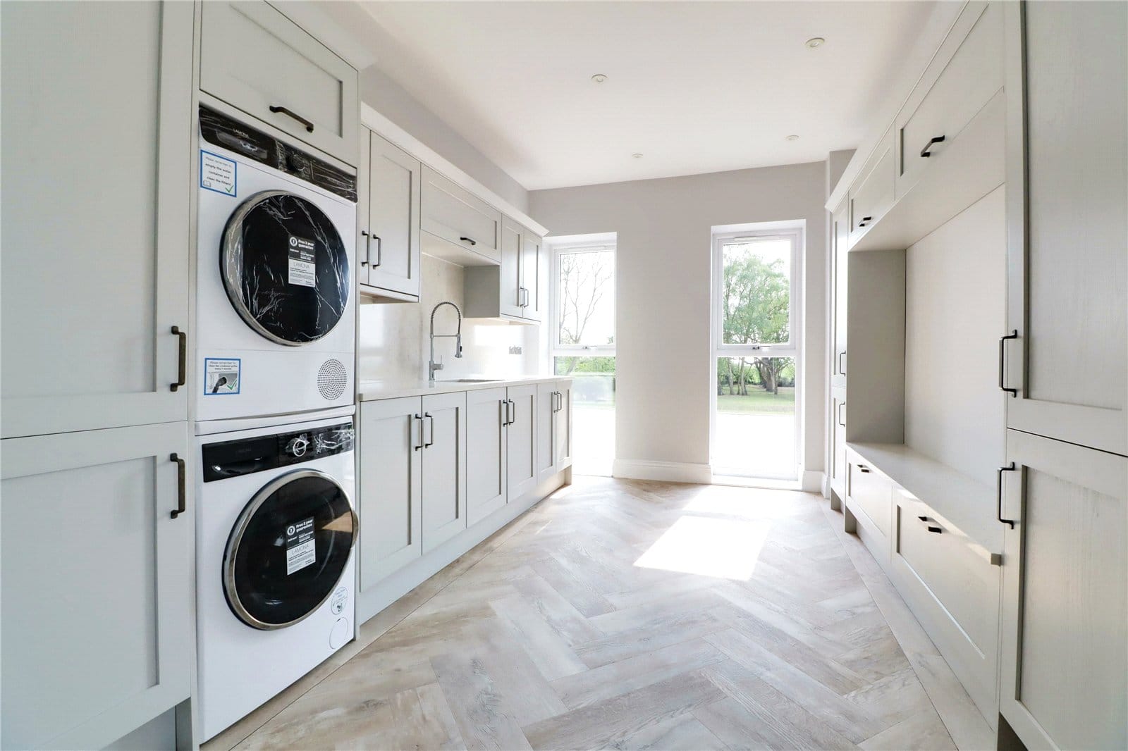 Has matching herringbone flooring with underfloor heating, large storage cupboard with underfloor heating manifold, cylinder tank and controls.