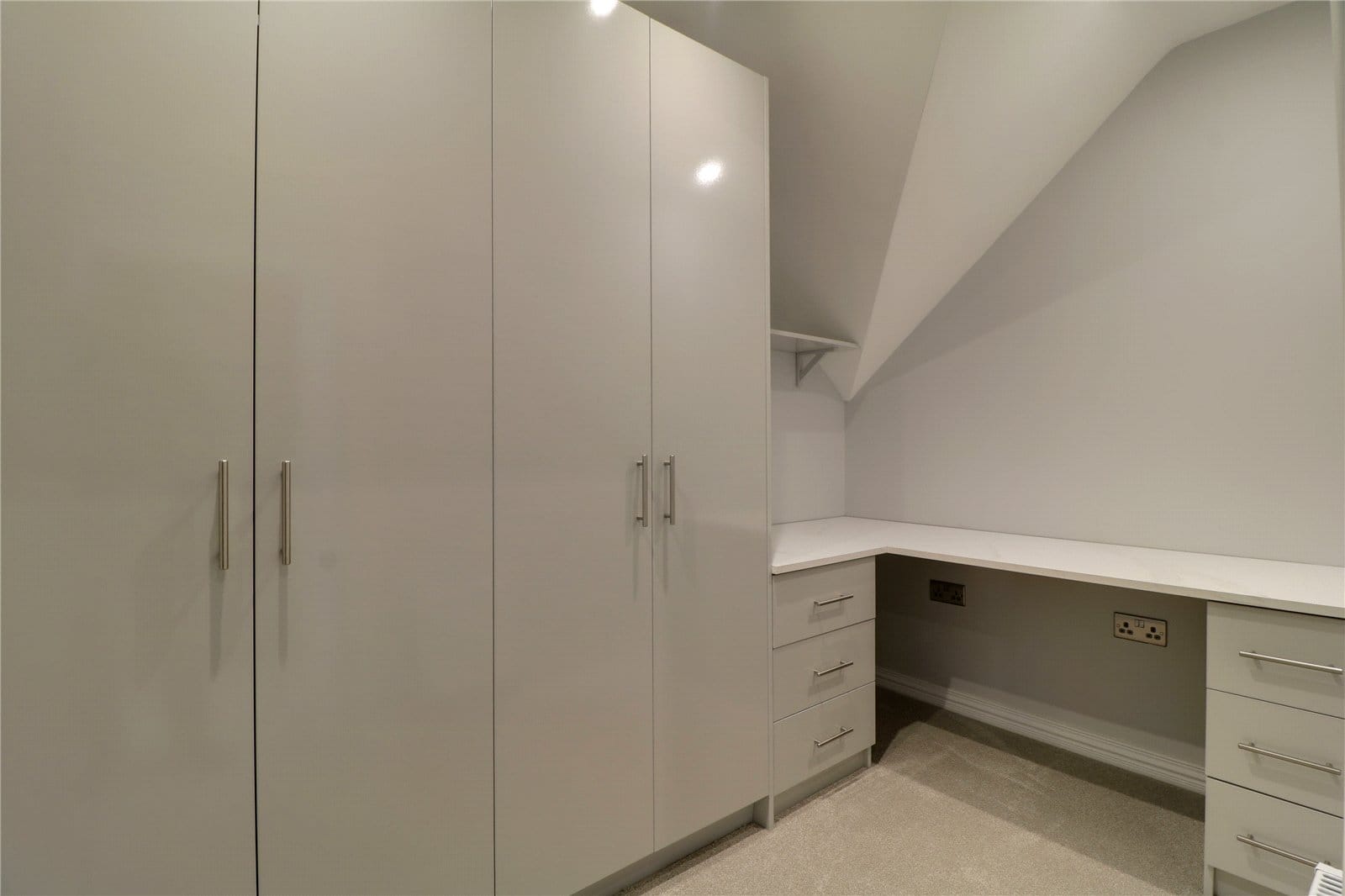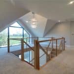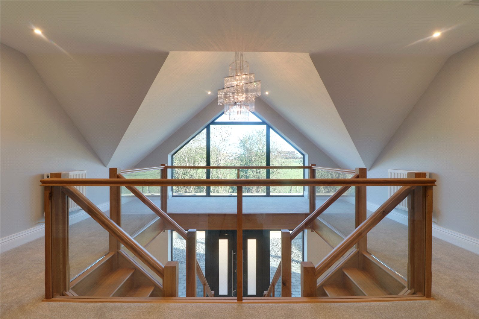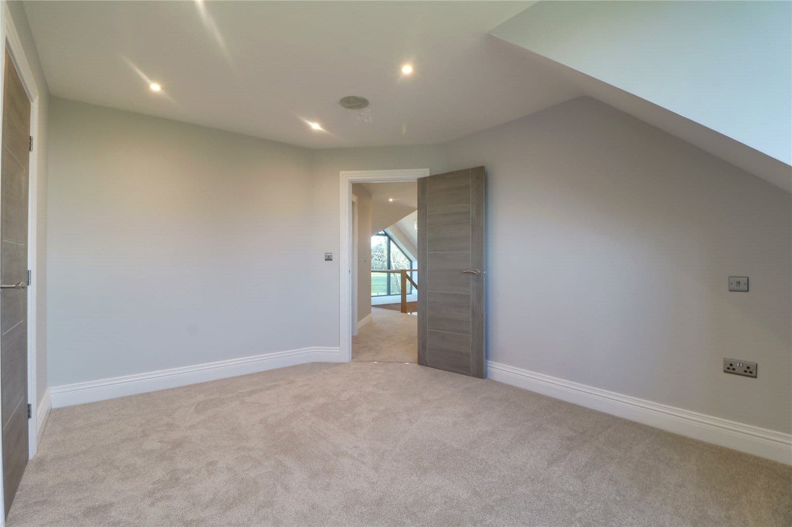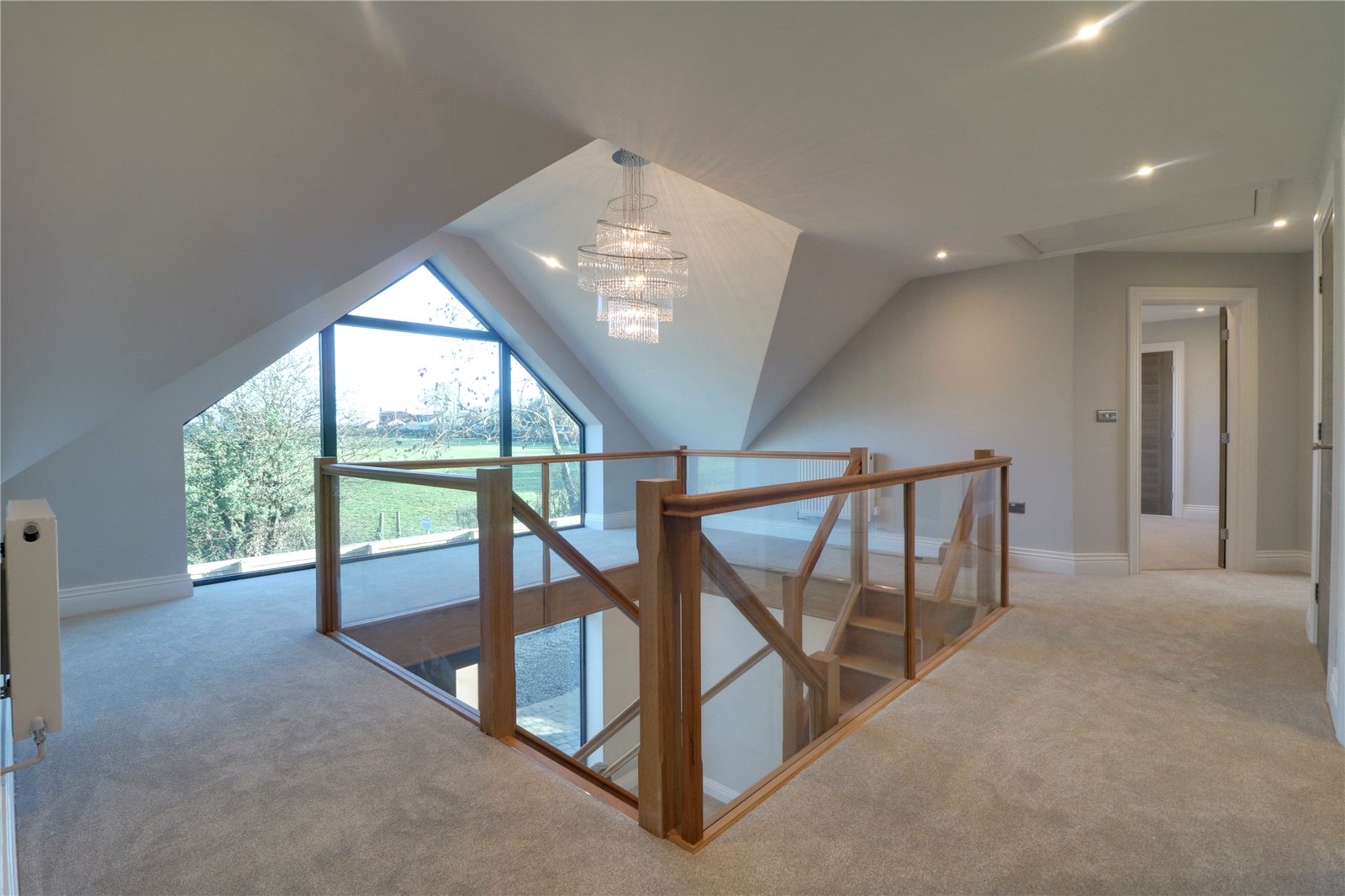 With feature front pitched double glazed window, continuation of open glazed balustrading, inset ceiling spotlights, loft hatch, twin storage cupboard and doors through to;