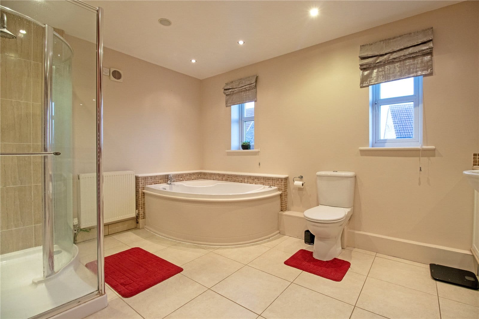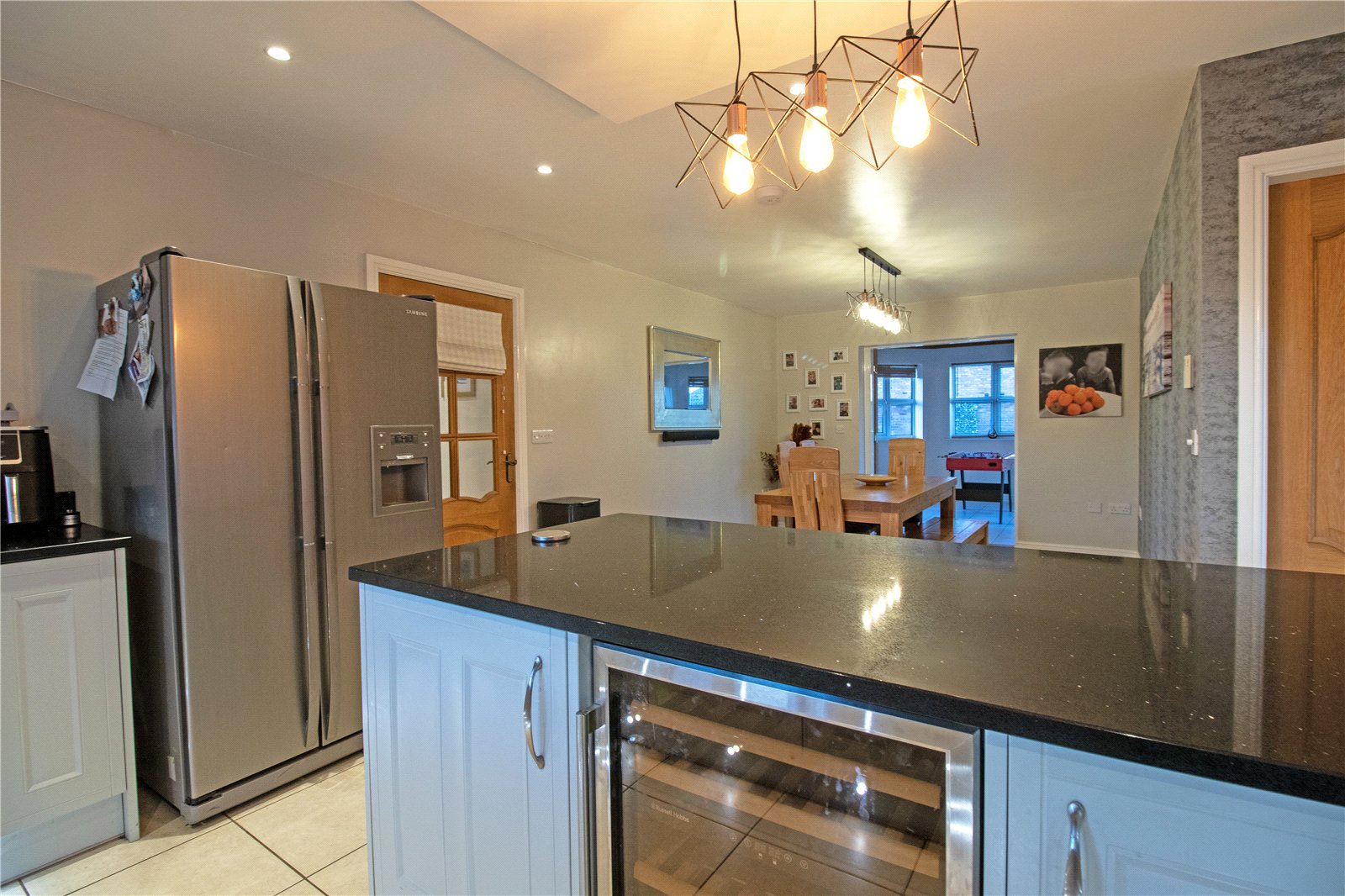 The accommodation is both generous and beautifully arranged. A welcoming entrance hallway leads to a spacious lounge featuring a characterful log-burning stove, a dedicated study, a cosy snug, and a magnificent open-plan kitchen/diner fitted with integrated appliances — the perfect hub for family life and entertaining. A light-filled sun room, fitted utility room and ground-floor WC complete the excellent ground-floor layout. To the first floor, four double bedrooms are serviced by a luxurious four-piece family bathroom. Two of the bedrooms enjoy en-suite facilities, with the principal suite boasting a particularly impressive en-suite complete with jacuzzi corner bath, double shower enclosure and his-and-hers sinks.