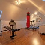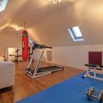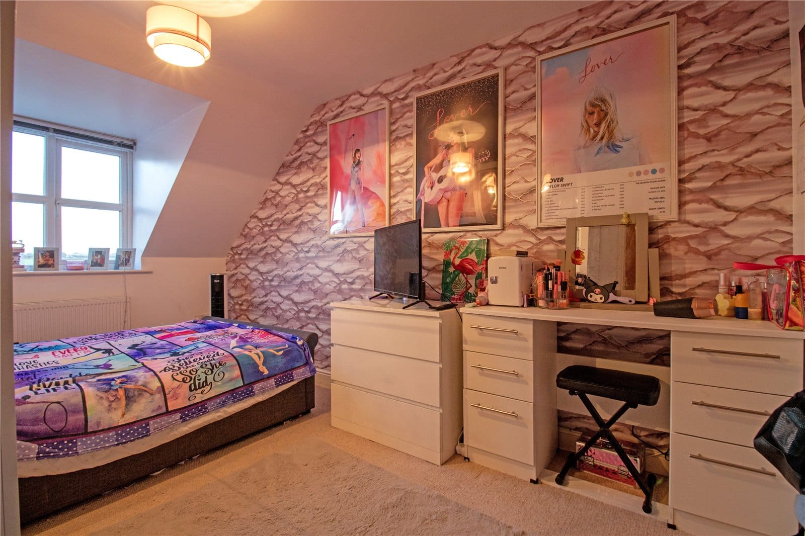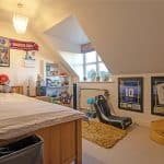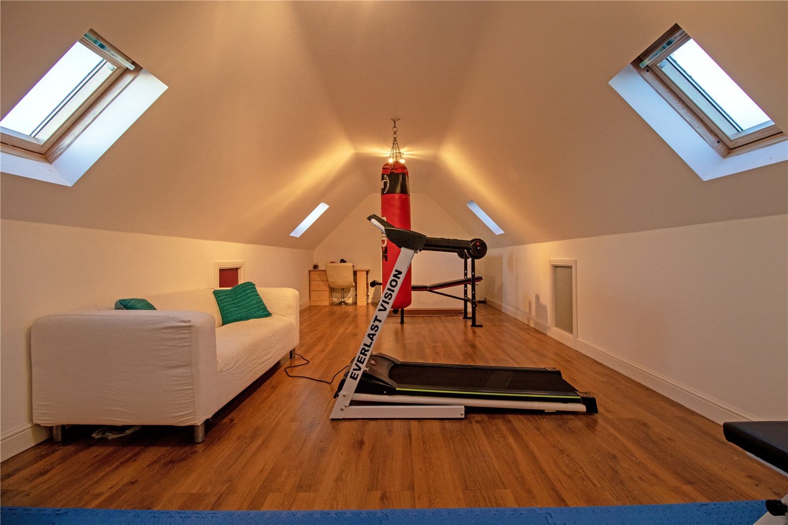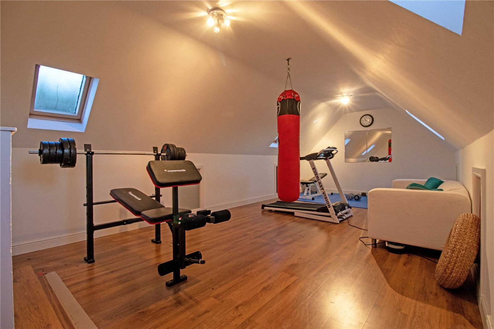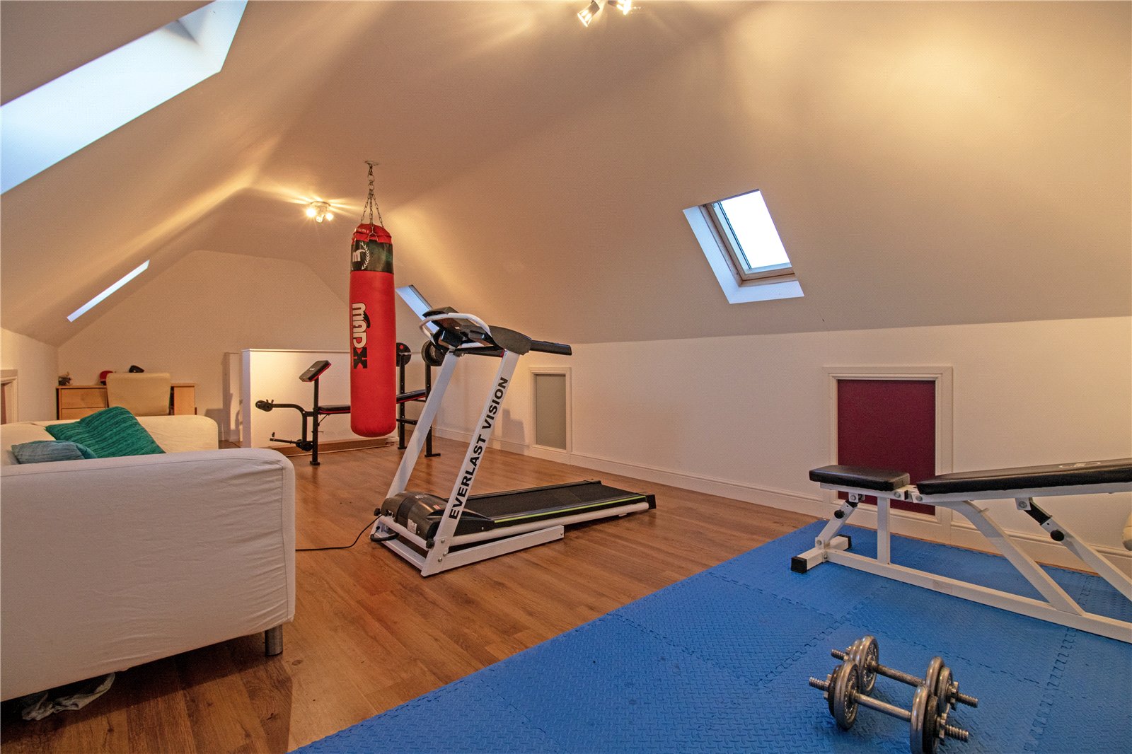 Outside, the property continues to impress. A timber gate opens onto a generous pebbled driveway offering extensive parking and access to the detached double garage, equipped with power, lighting and an electric door. Above the garage sits a superb versatile space currently used as a gym — ideal as a studio, office, hobby room or guest suite. The enclosed rear garden is a fantastic size, mainly laid to lawn with a patio area perfect for outdoor dining and summer entertaining, and features fitted external power sockets for added practicality.