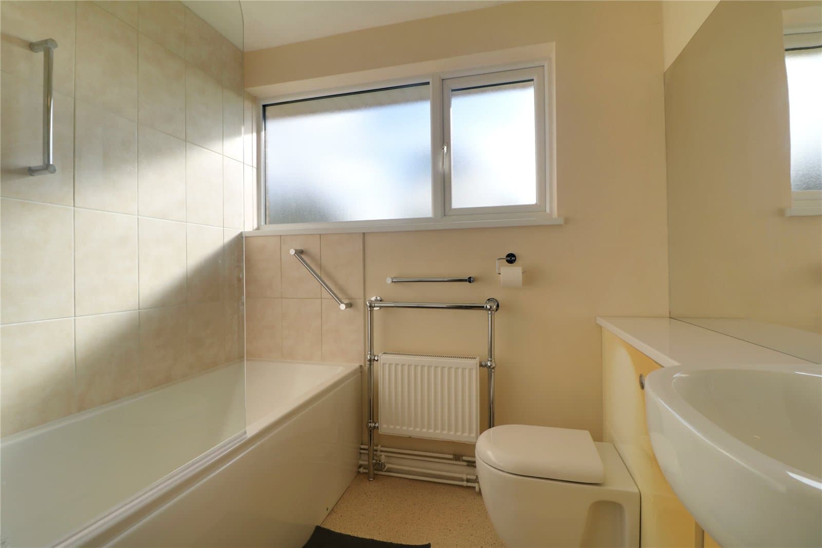 With a rear uPVC double glazed window with frosted glazing, a three piece suite comprising a panelled bath with overhead Tritan electric shower with tiled splash backs and glazed screen, a low flush WC and a oval wash hand basin with storage units beneath, cushioned flooring and extractor fan.