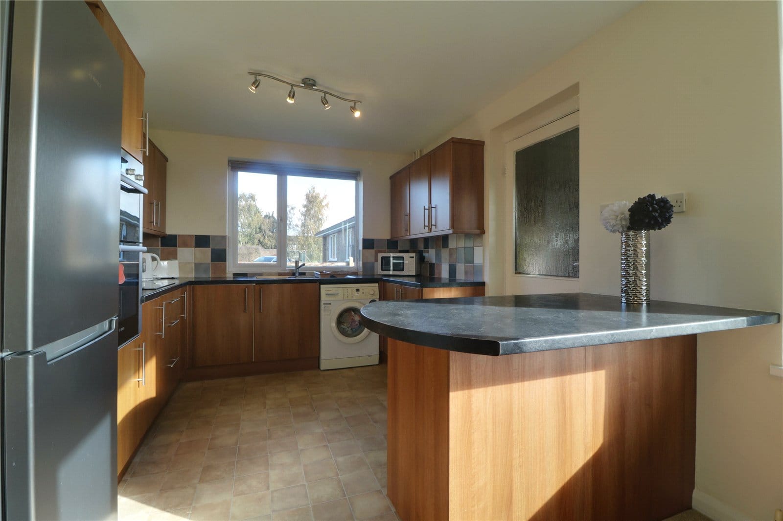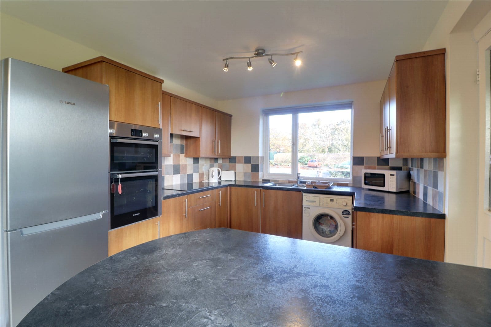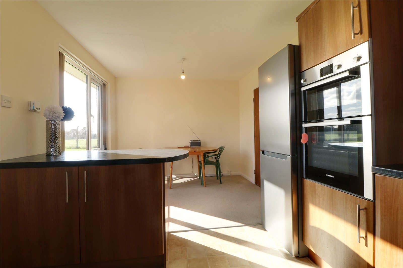 With a dual aspect including rear and side uPVC double glazed windows. The kitchen includes a range of dark pine low level units, drawer units and wall units with brushed aluminium style pull handles and a patterned working top surface incorporating a one and a half stainless steel sink unit with block mixer tap and drainer to the side with tiled splash backs, plumbing for a washing machine with the option for plumbing for a dishwasher, induction four ring Bosh hob with overhead canopied extractor fan, adjoining matching Bosh electric oven with grill above, space for a tall fridge freezer, vinyl cushioned flooring, matching breakfast bar recess with units beneath and an internal glazed door leads through to;