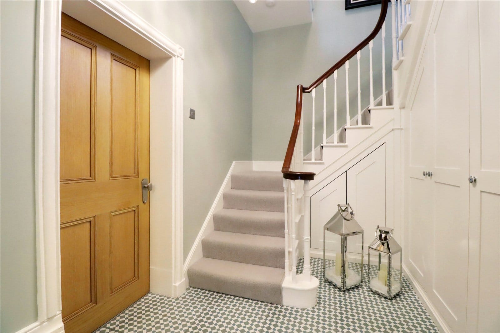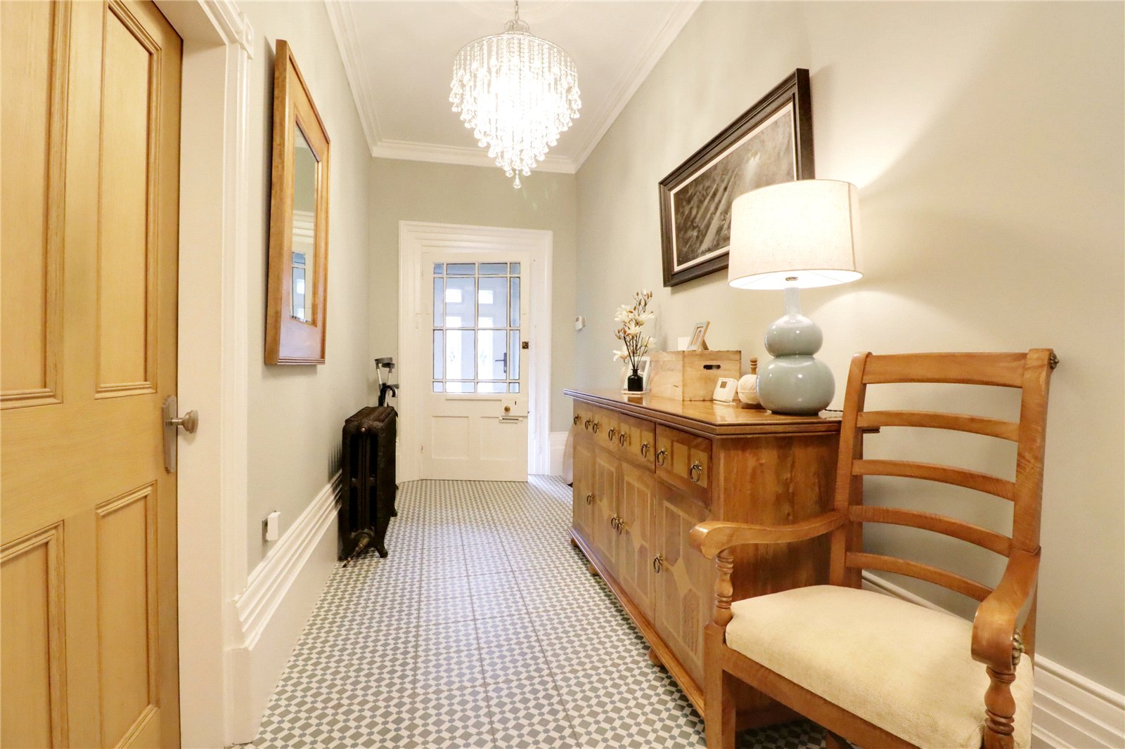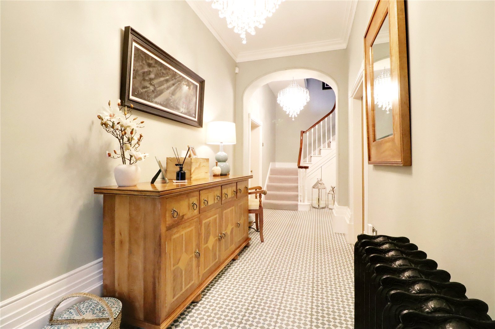 Enjoying a return staircase to the first floor with original balustrading and polished contrasting handrail fitted with understairs storage, detailed tiled flooring, wall to ceiling coving, ceiling rose, handsome free standing radiator and doors through to;