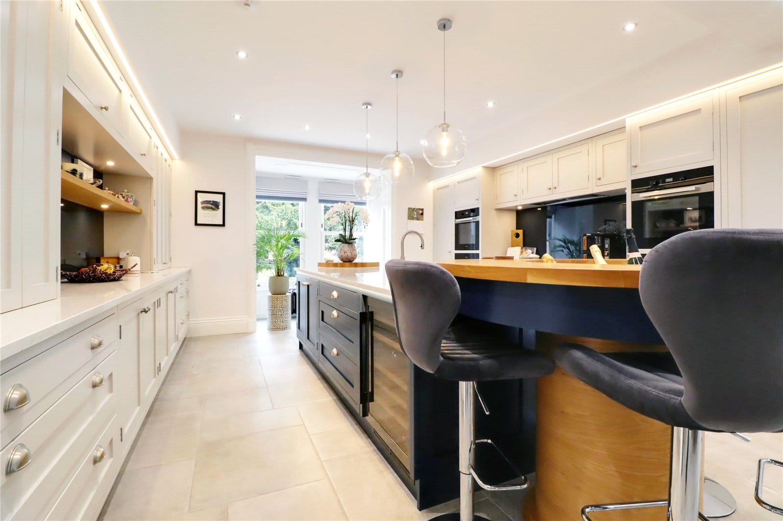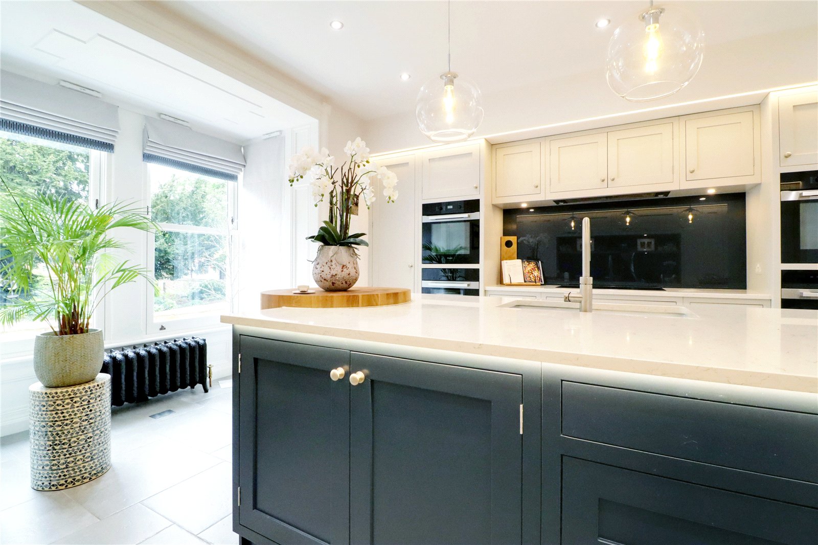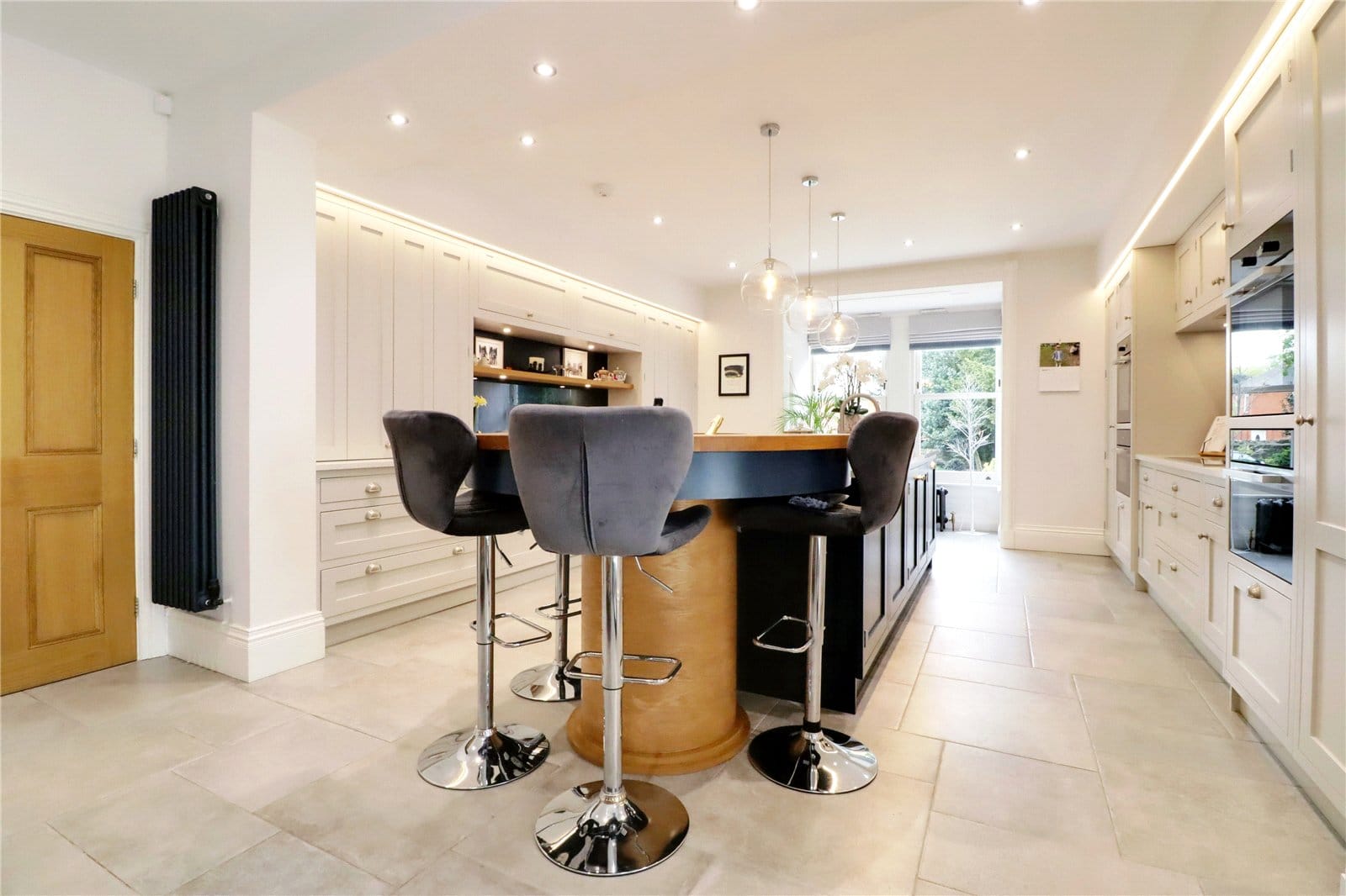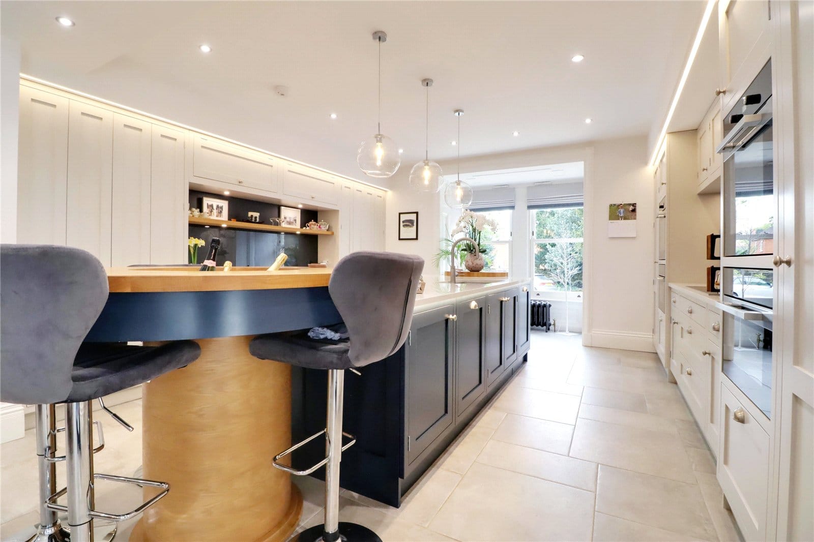 Plus a projecting box bay window with front and side vertical sliding uPVC double glazed sash windows with period free standing radiator beneath and inset sockets and a side three panelled bi folding doors with internal blinds proves access to the entertaining garden, tiled flooring, feature double ended fireplace with a multi fuel stove which looks through to the sitting room and inset ceiling spotlights. The kitchen is fitted with a most luxurious individually designed kitchen of a shaker style in contrasting shades of soft grey and royal blue with cupped and pull stainless steel handles, enjoying a quality granite top that incorporates an electric hob with extractor above and Miele ovens, microwave and warming drawers to either side, a central island features a double ceramic sink unit with block cooker tap with integrated wooden chopping board and a feature breakfast bar with central drinks cooler and integral fitted appliances.