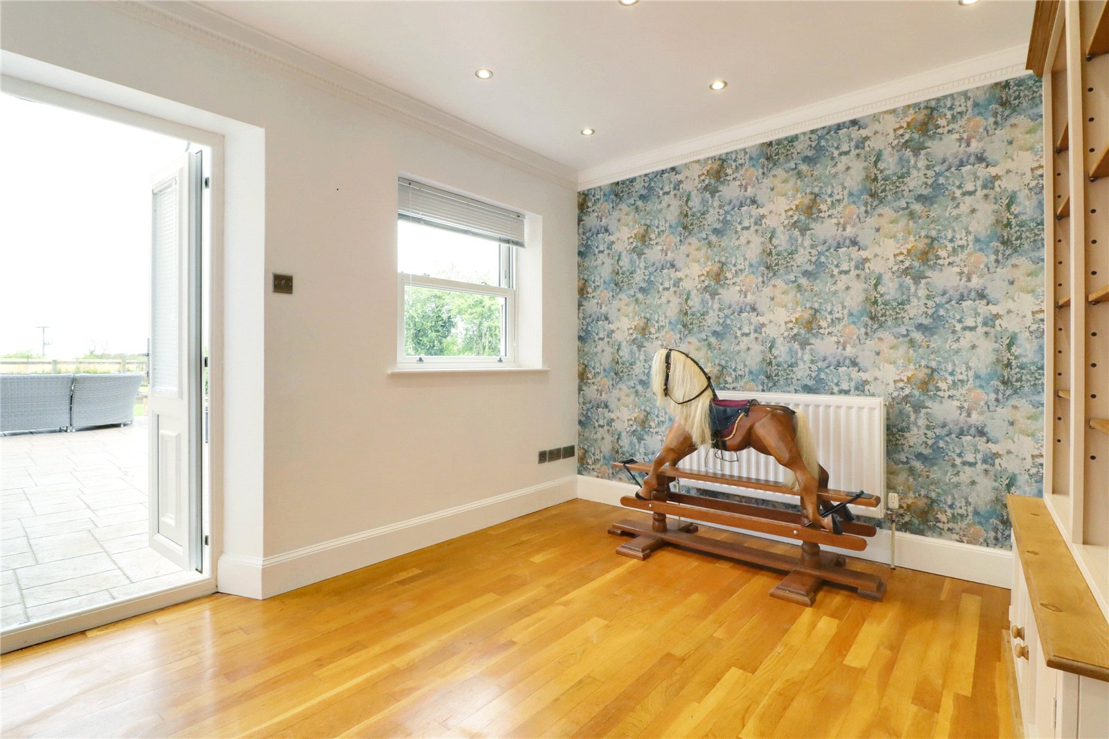 Rear vertical sliding uPVC double glazed sash window, matching French doors with fitted blinds allow access to the garden, polished wooden flooring, wall to ceiling coving and inset ceiling spotlights.