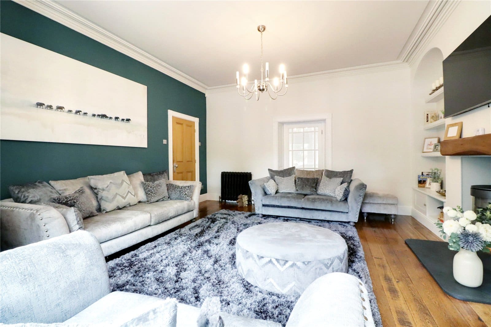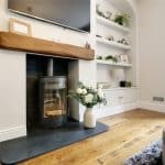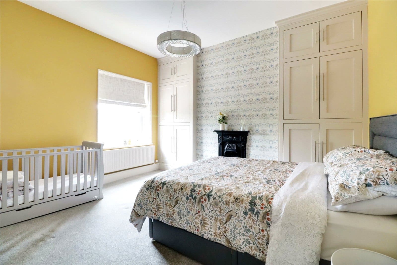 Side vertical sliding uPVC double glazed sash window and a handsome cast iron decorative fireplace with adjoining bespoke wardrobes to either side.