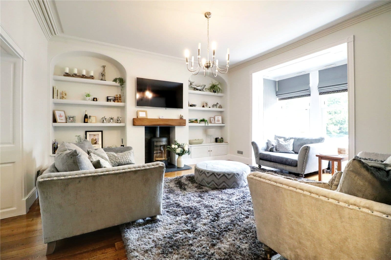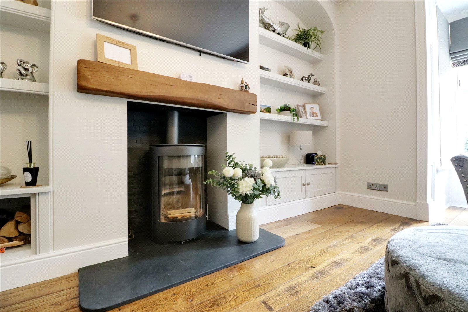 Plus a projecting box bay window with front and side vertical sliding uPVC double glazed sash window, original floorboards with free standing period radiator, contemporary glass fronted multi fuel stove with a projecting raised slate hearth, wooden beam mantel and open arch top display shelving with storage to either side, wall to ceiling coving and doors through to;