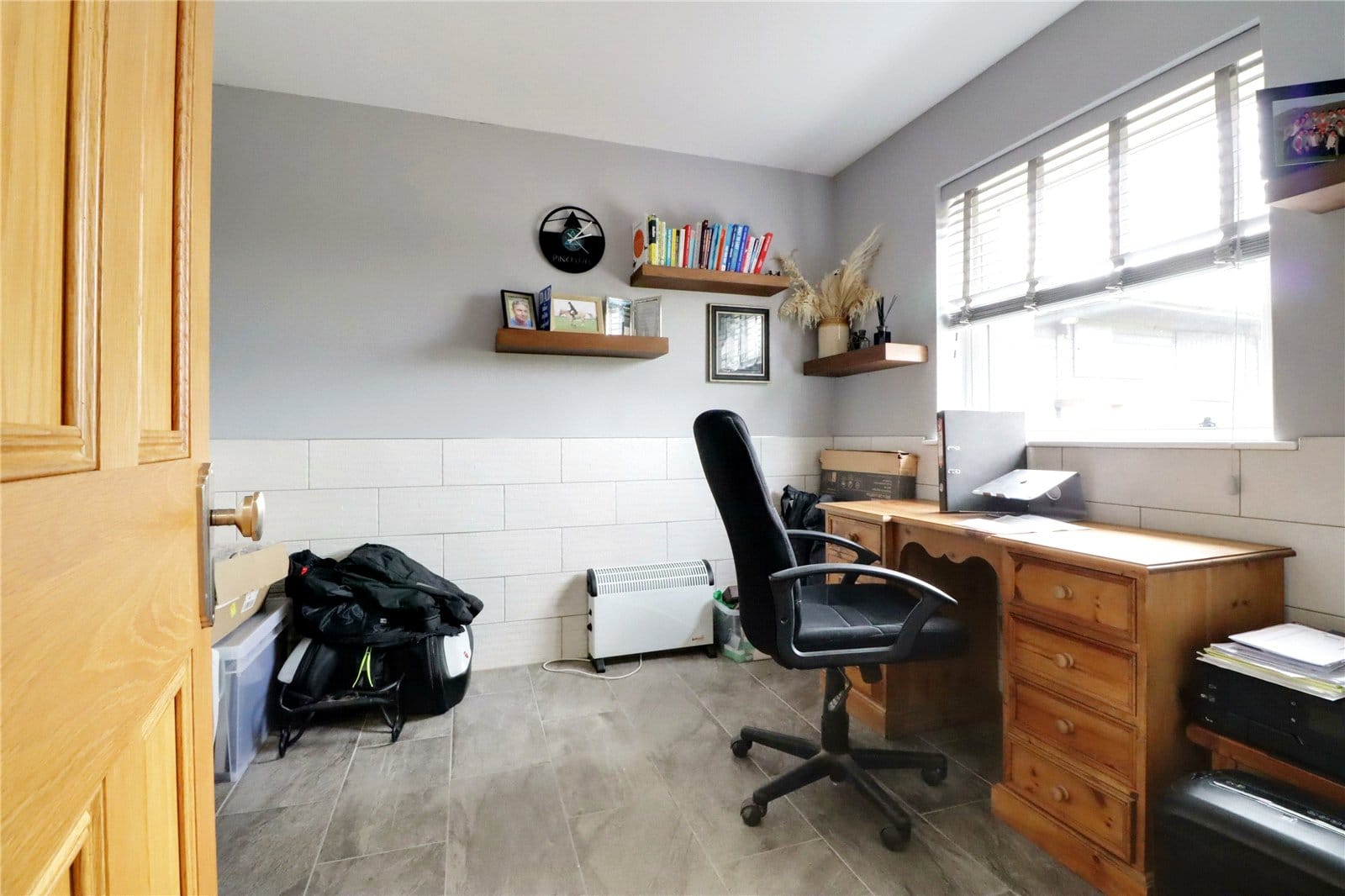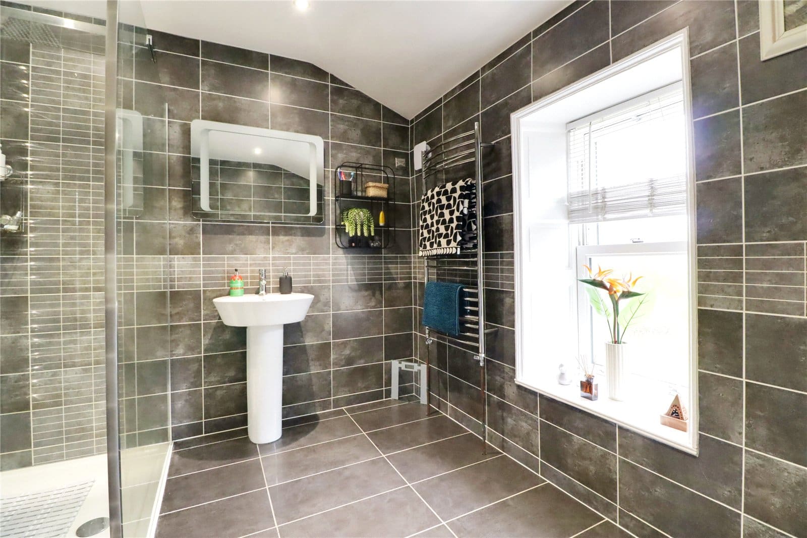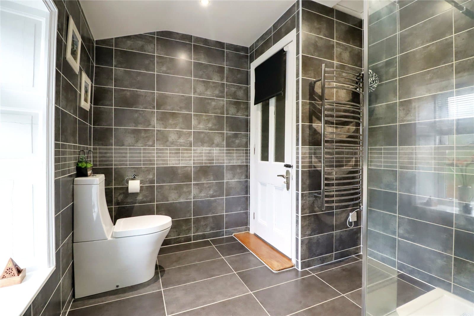 Side vertical sliding uPVC double glazed sash window, tiled flooring, part tiling to walls with chrome edging and fitted electric heater.