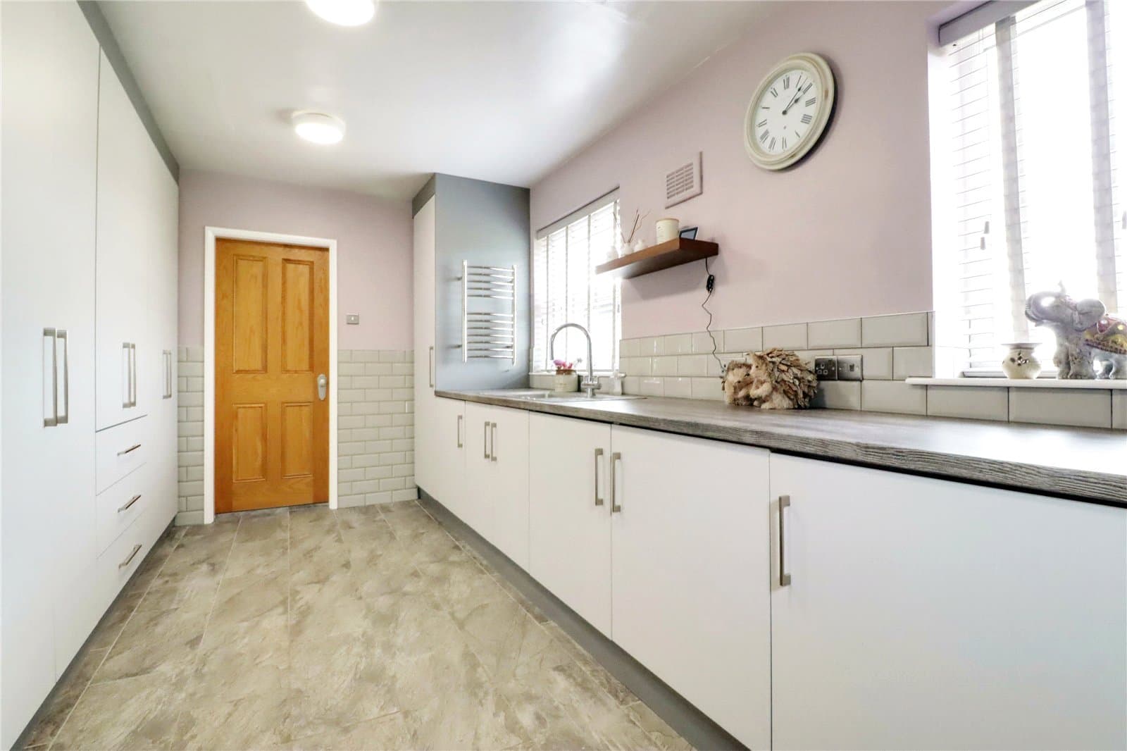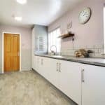 Side uPVC double glazed entrance door with patterned glazing, rear uPVC double glazed windows, being generous fitted with white fronted furniture with brushed aluminium style pull handles with an above patterned worktop with tiled splash backs incorporating a stainless steel sink unit with block mixer tap, tiled flooring, modern fitted radiator and a concealed gas central heating boiler.
