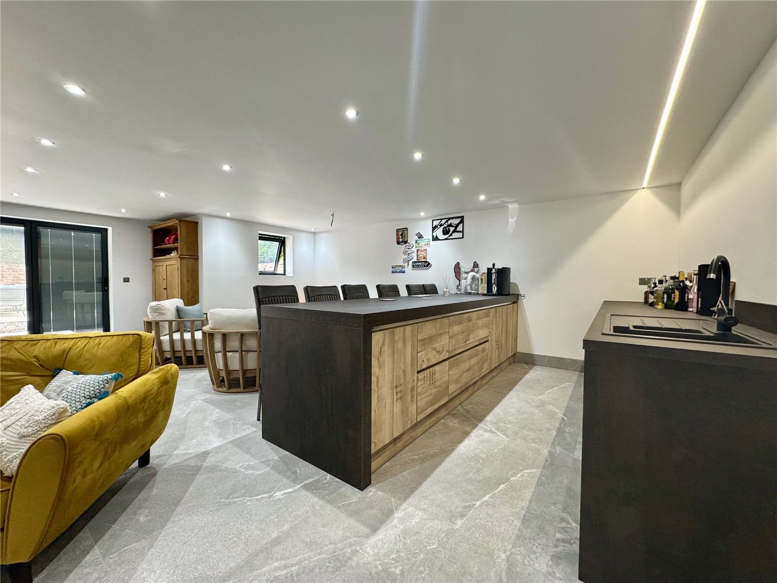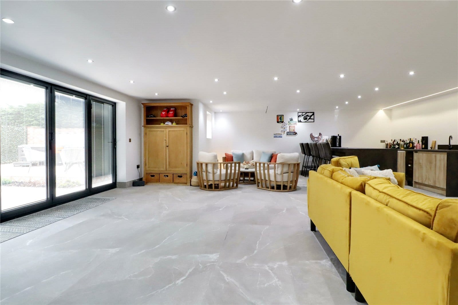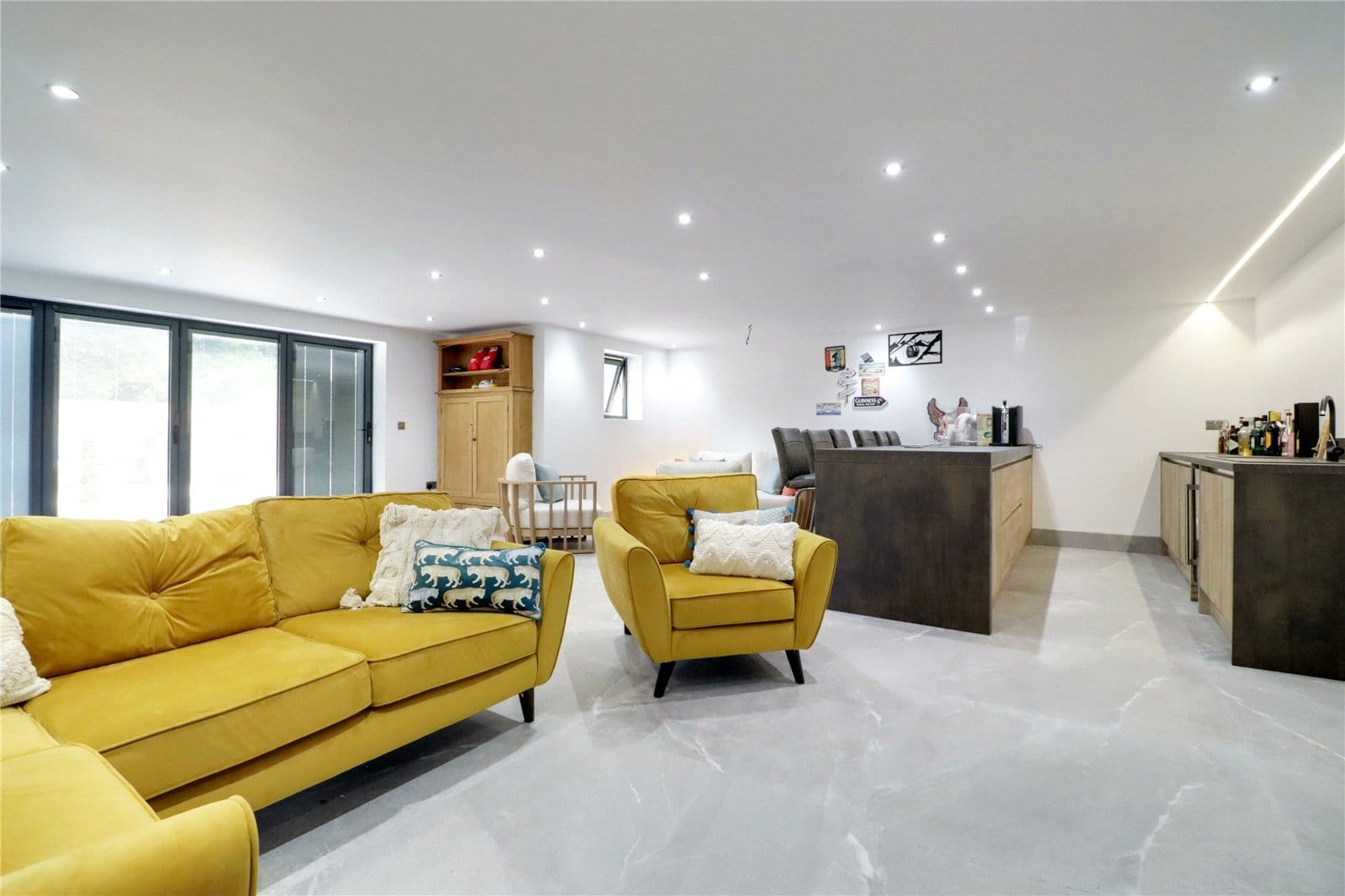 The property provides the benefit of a newly constructed annex/games room with the main room enjoying a five panelled front facing bi-folding doors with internal blinds, front facing uPVC framed double glazed windows, side composite door, features tiled flooring with matching skirting boards and underfloor heating, contemporary fitted kitchen of a wooden style with integral appliances and a quality worktop incorporating a one and a half bowl sink unit with block mixer tap, inset ceiling spotlights and doors through to;