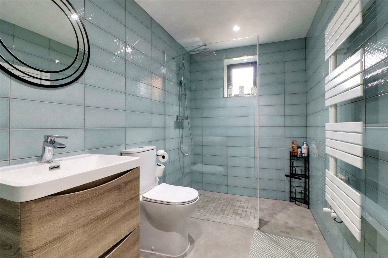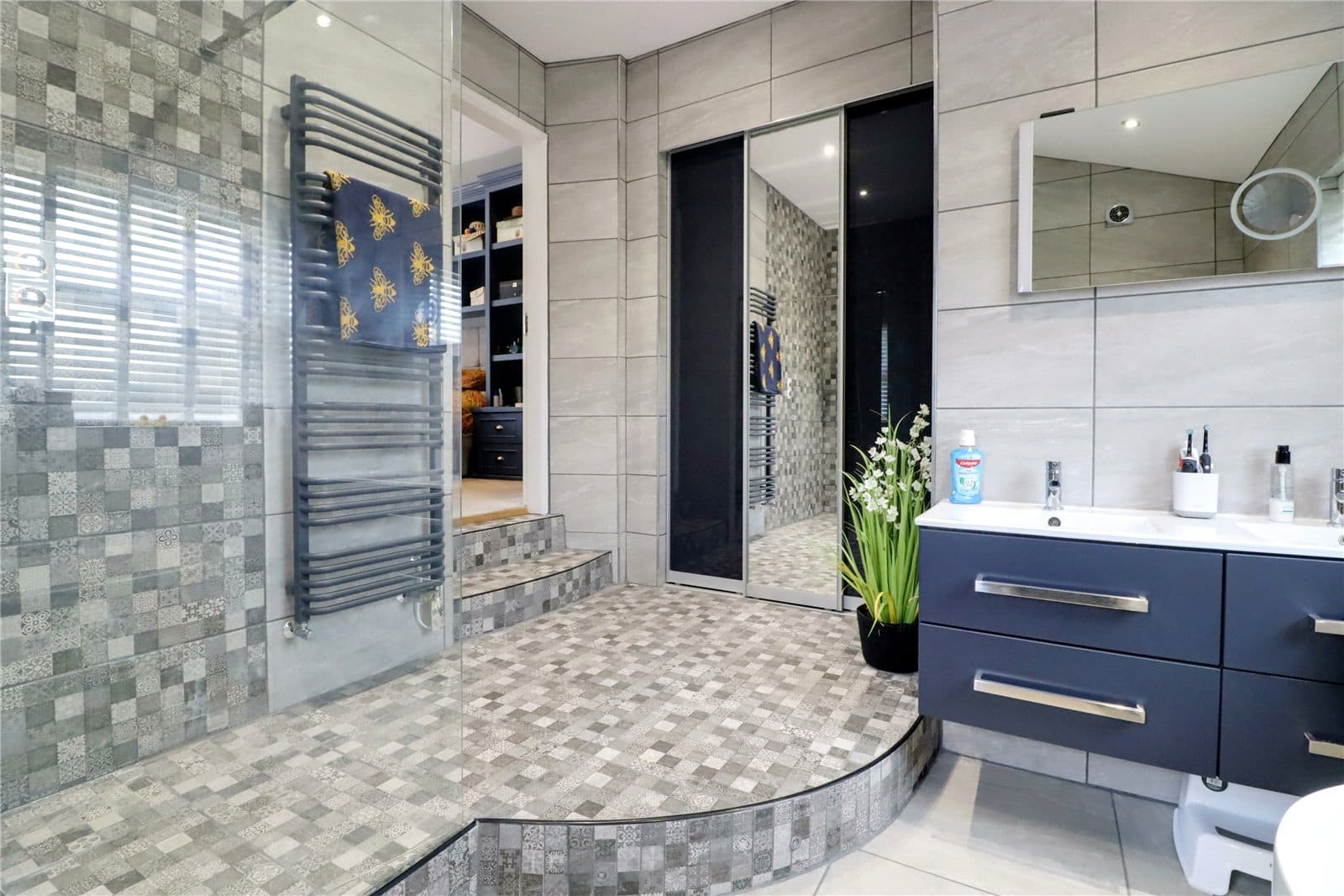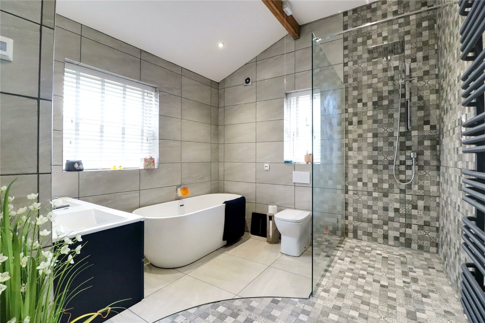 Benefitting from a dual aspect with rear and side uPVC double glazed windows with patterned glazing, providing a suite in white consisting of a low flush WC, free standing double ended bath with wall mixer tap, twin wash hand basins with vanity drawer beneath and LED mirrored backing, walk-in shower cubicle with Smart App controls, terma towel rail, tiled flooring with underfloor heating, matching tiling to walls with chrome edging and inset ceiling spotlights.