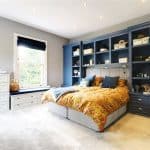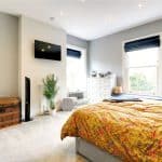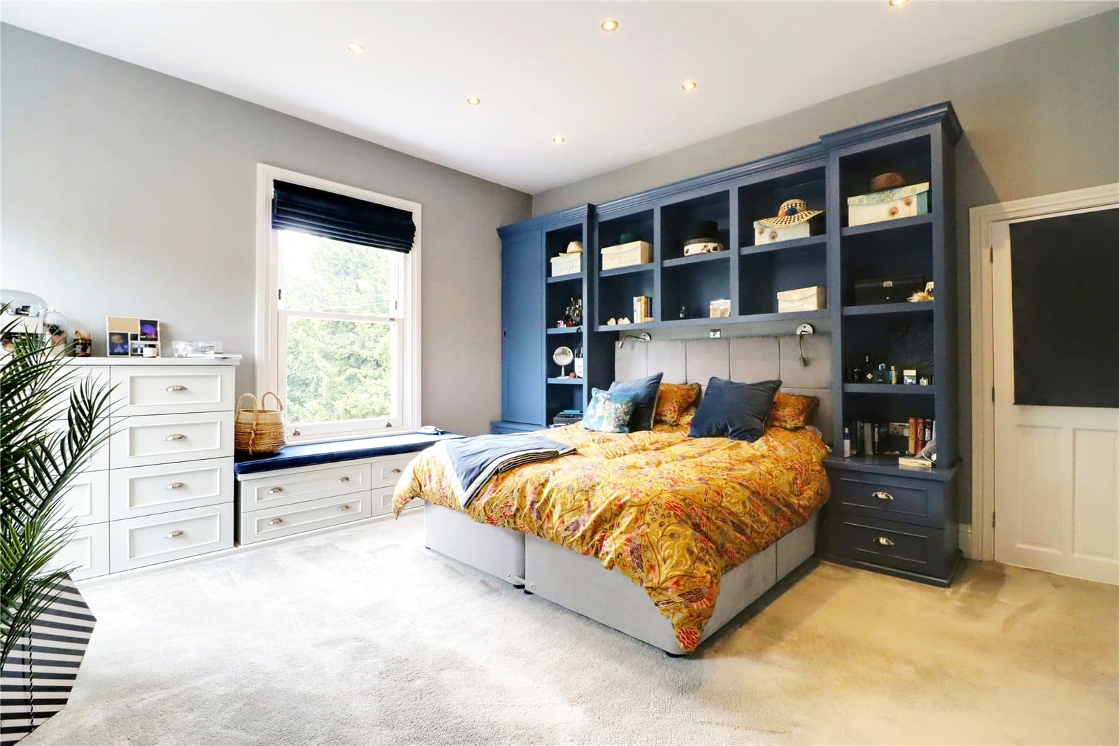 Provides a dual aspect with front and side uPVC double glazed window vertical sliding sash windows, bespoke fitted furniture with display shelving, further wardrobes with sliding doors, TV point, stylish radiator, inset ceiling spotlights and doors through to;