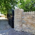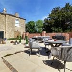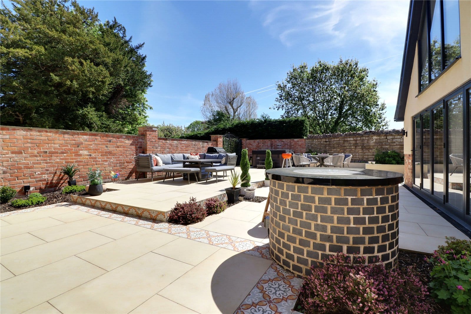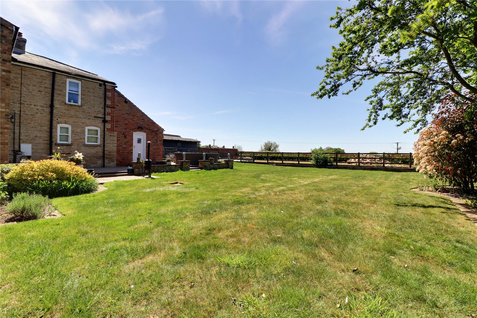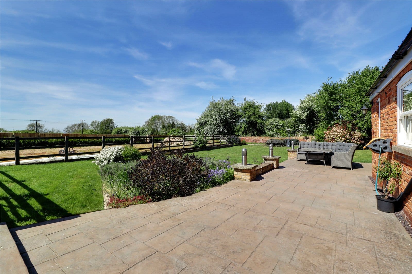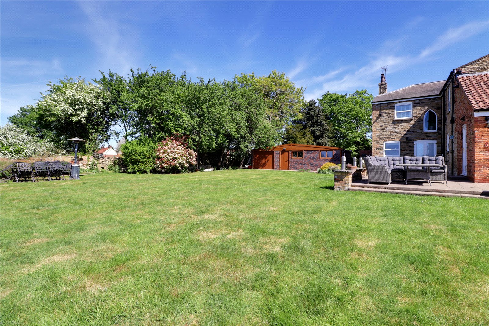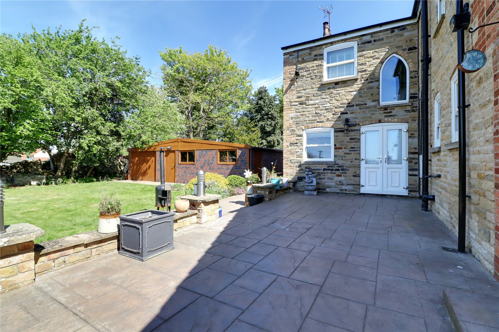 The property enjoys substantial gardens being privately set towards the fringe of the town and enjoying open paddock views to the rear. To the front the property sits being traditional stone boundary walling with twin entry via electric remote operated wrought iron gates onto a substantial pebbled driveway allowing parking for a large number of vehicles with room for a motorhome or caravan if required and allows direct access to the garage. The gardens are well stocked with mature trees, shrubs and plants with borders being barked filled. Within the driveway there is a circular flagged seating area which has electrics for a light feature or fountain if required. A dwarf bricked wall with inset lighting has central flagged steps leading to the entrance door. Gated access to either side of the property leads to the remaining garden which comes between the house and the outbuilding which has been landscaped creating a superb split level entertaining area with contrasting tiled detailing with provision for a hot tub enjoying an excellent degree of privacy and having an original well with glass top. The rear garden enjoys an excellent degree of privacy and enjoys a westerly aspect with the principal garden being lawned with mature borders and a fenced enclosed garden which has a multitude of uses. Adjoining the rear of the property is a patterned concrete seating area with boundary walling and charming coping tops.