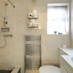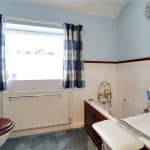 Rear uPVC double glazed window with patterned leaded finish provides a suite comprising a close couple low flush WC, adjoining vanity wash hand basin, walk-in shower with mains shower and tiled finish to walls.
