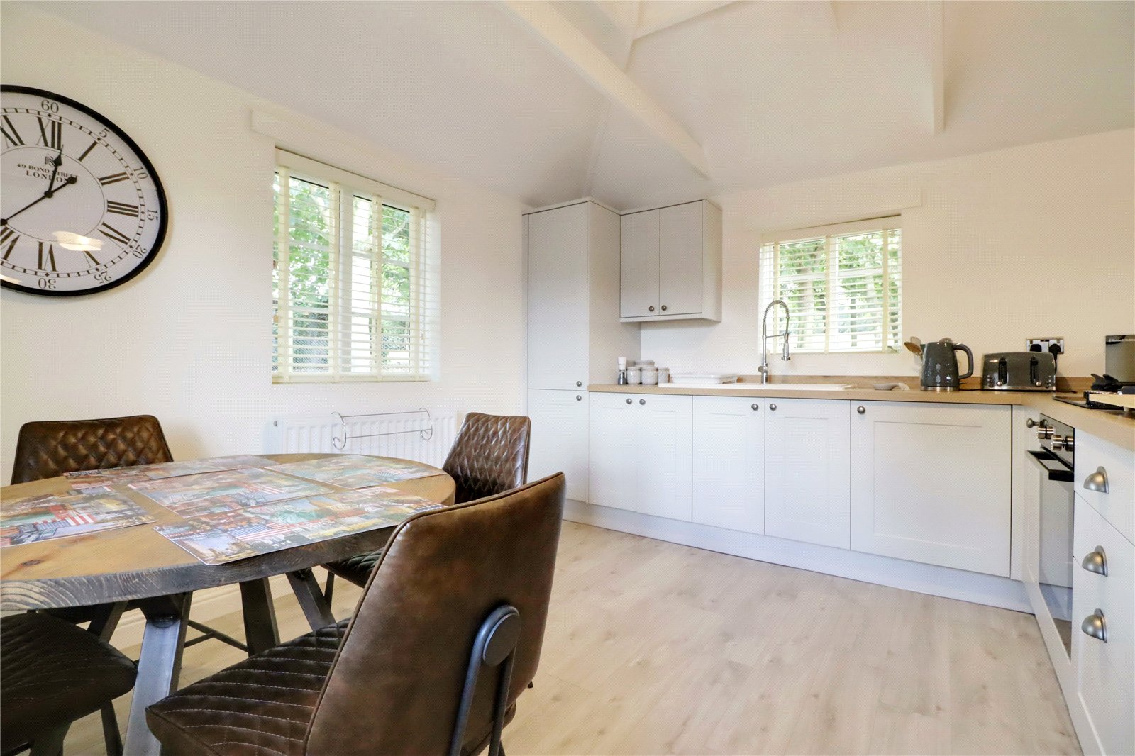With a composite entrance door and front, side and rear uPVC double glazed windows. The kitchen enjoys a quality range of shaker style furniture with button pull handles with complementary button style worktop which continues to create a breakfast bar and incorporates a one and a half bowl ceramic sink unit with drainer to the side and block mixer tap, built-in four ring gas hob with oven beneath, laminate floor to the kitchen area, feature vaulted ceiling, TV point and internal oak doors leads through to;