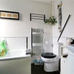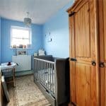 Large side Velux roof light, laminate flooring, built-in storage cupboard with hanging rail and shelving and further built-in boiler cupboard housing a wall mounted gas fired central heating boiler.