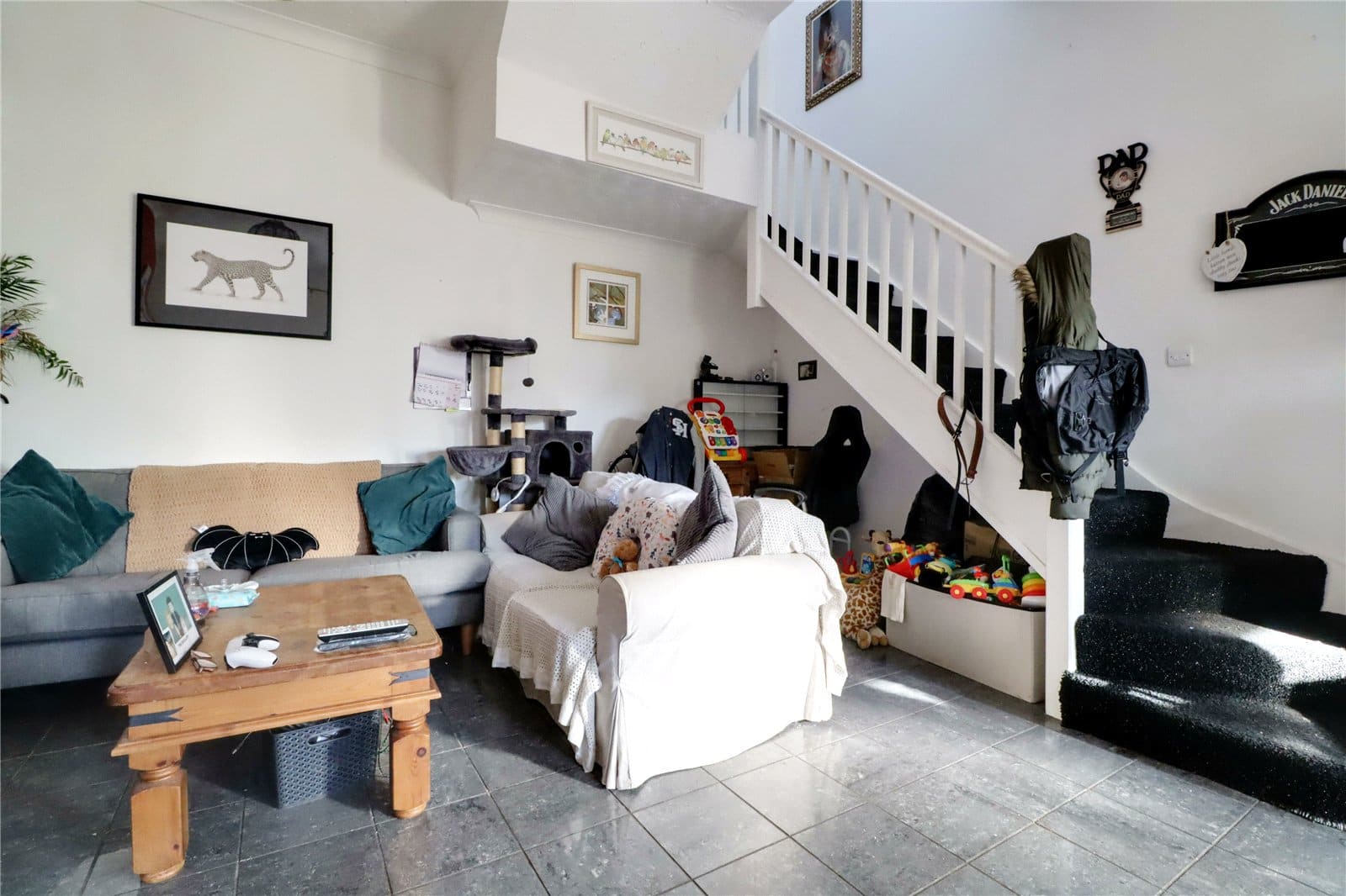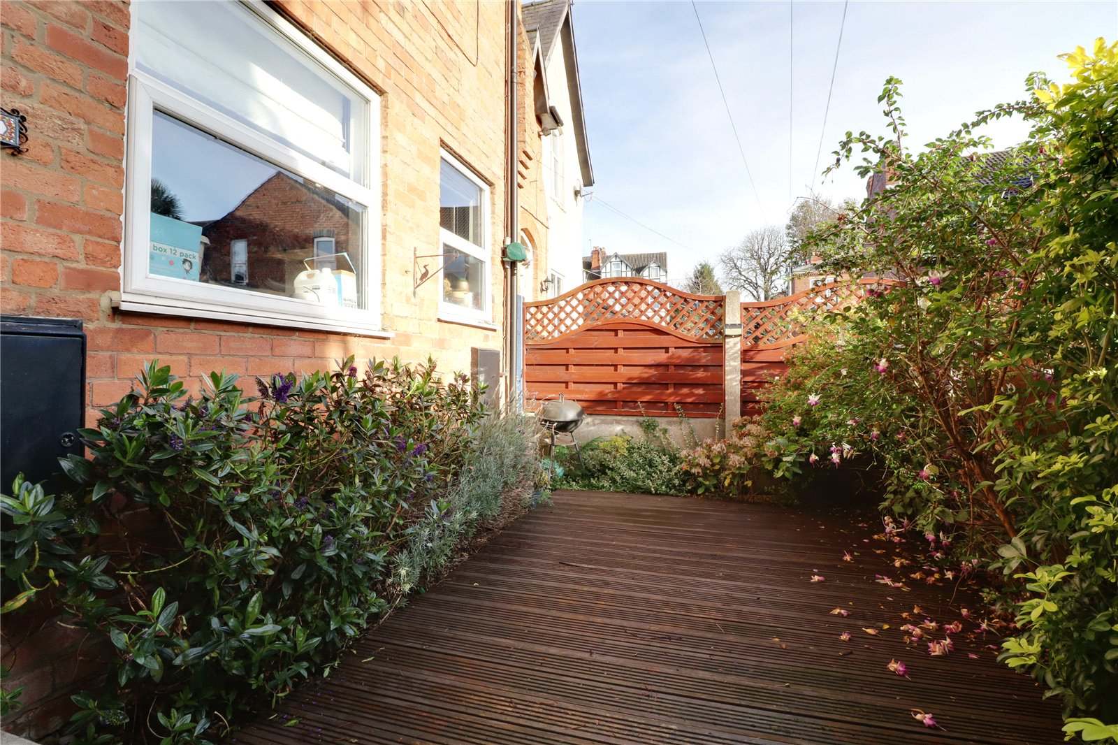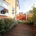 To the front the property enjoys enclosed courtyard style garden finished with decking with surrounding planted borders and flagged steps to the front door. The property benefits from a block paved driveway that leads to a garage with adjoining planted border.