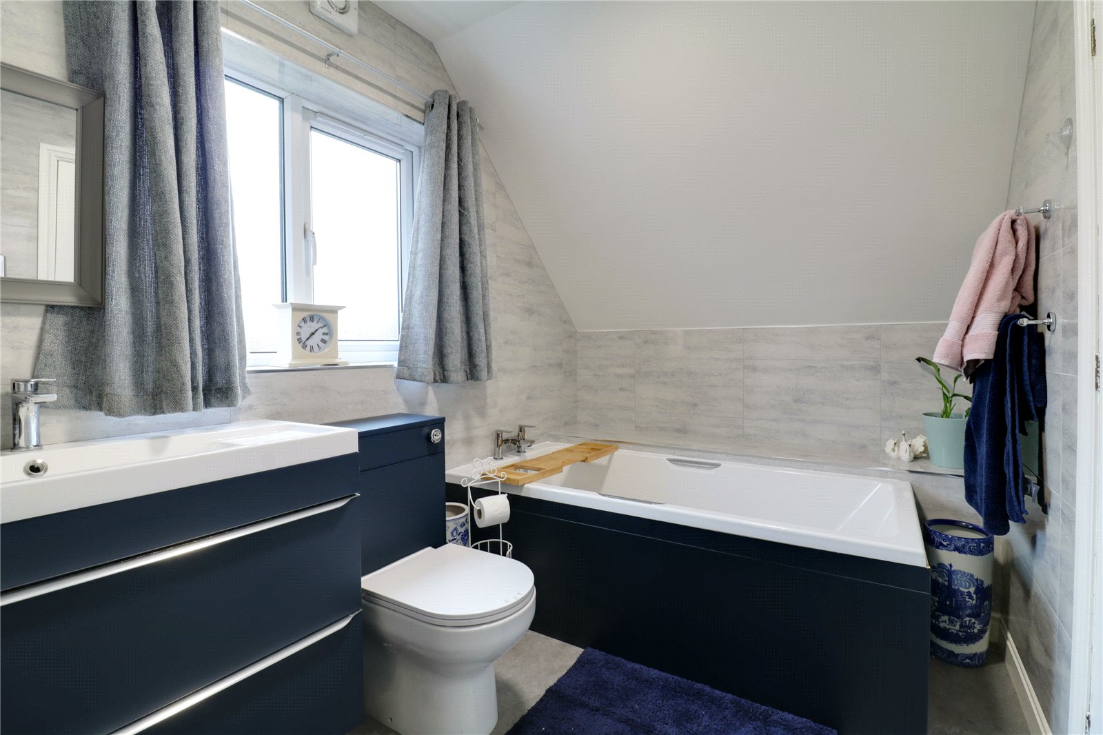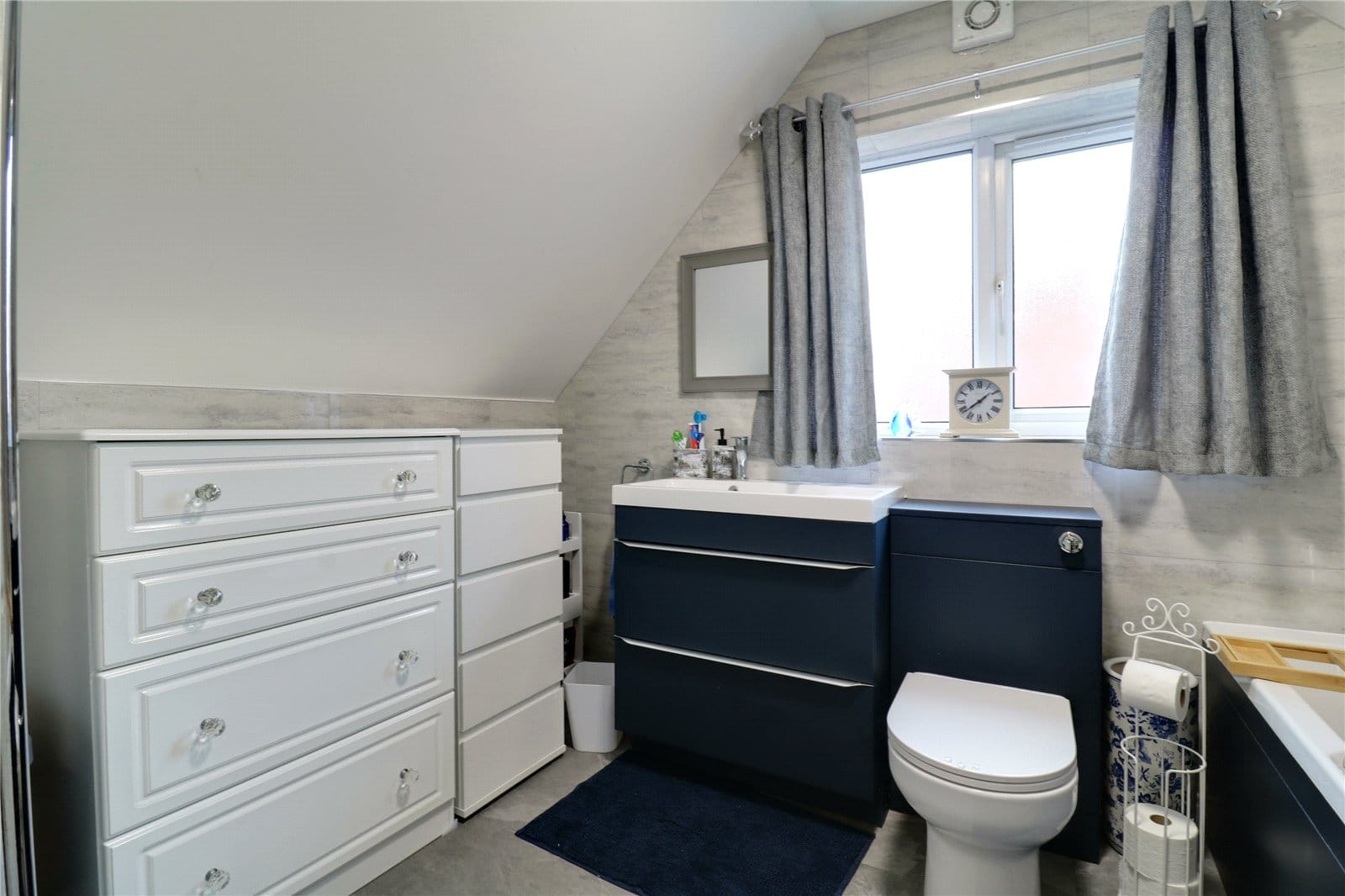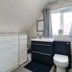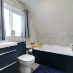With a rear uPVC double glazed window with frosted glazing providing a three piece suite comprising a panelled bath, a low flush WC with adjoining vanity wash hand basin with twin storage units beneath with a stainless steel handles, attractive laminate tiled effect flooring, chrome wall mounted wash hand basin, fully tiled walls and extractor fan.
