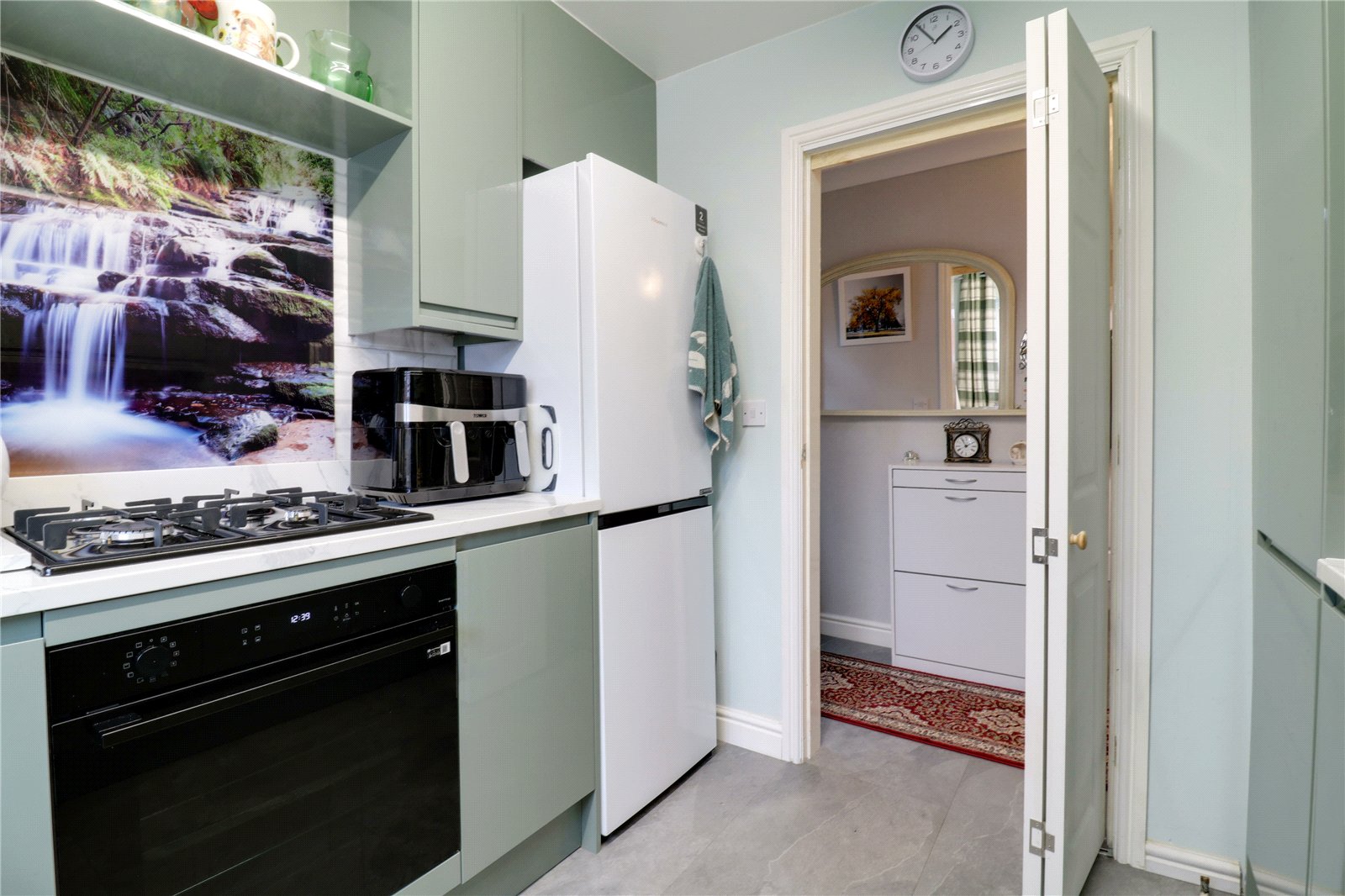 With a front uPVC double glazed window. The kitchen includes a range of Olive green and gloss fronted style low level units, drawer units and wall units with handleless pull handles and a quartz working top surface with matching uprising in a marble effect incorporating a single porcelain sink bowl unit with drainer to the side, the kitchen includes a range of appliances which includes a Samsung electric oven with Bosch four ring gas hob with attractive splash back, space for a tall fridge freezer, plumbing for a dishwasher and ceramic tiled splash backs to the uprising.