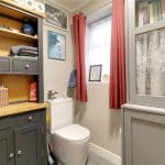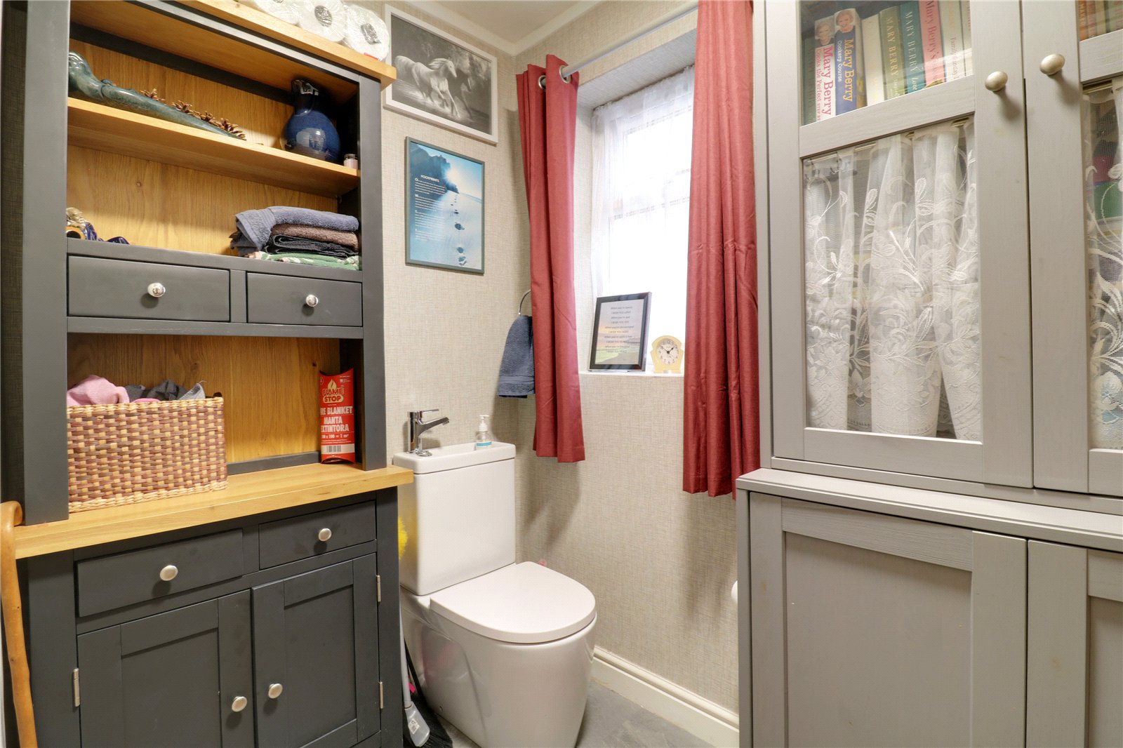With a side uPVC double glazed window with frosted glazing, continuation of laminate flooring and wall to ceiling coving.