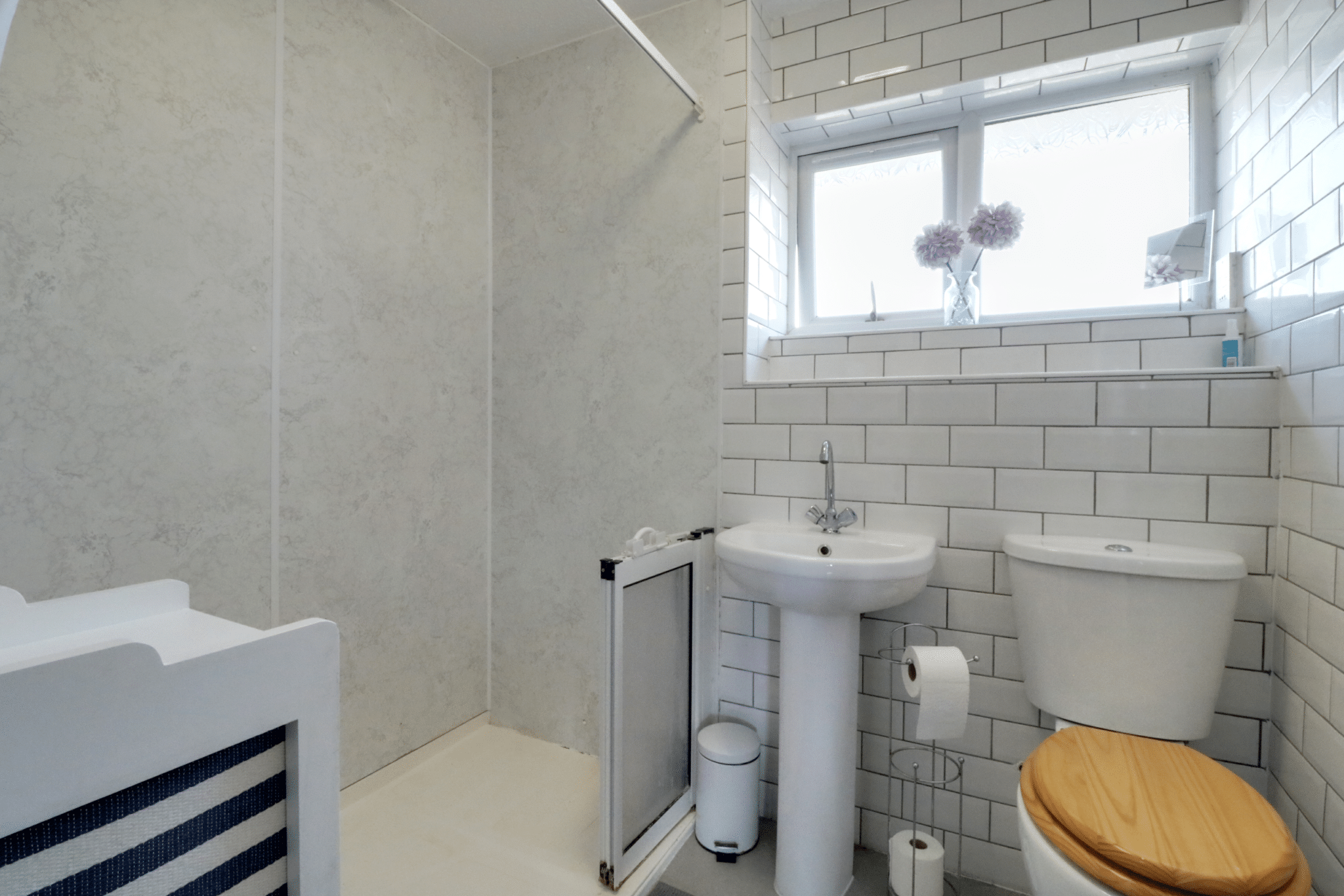Enjoying a rear uPVC double glazed window with frosted glazing, a three piece suite comprising a double walk in shower cubicle with overhead electric shower and mermaid boarding, pedestal wash hand basin, a low flush WC, attractive tiled walls and cushioned flooring.