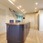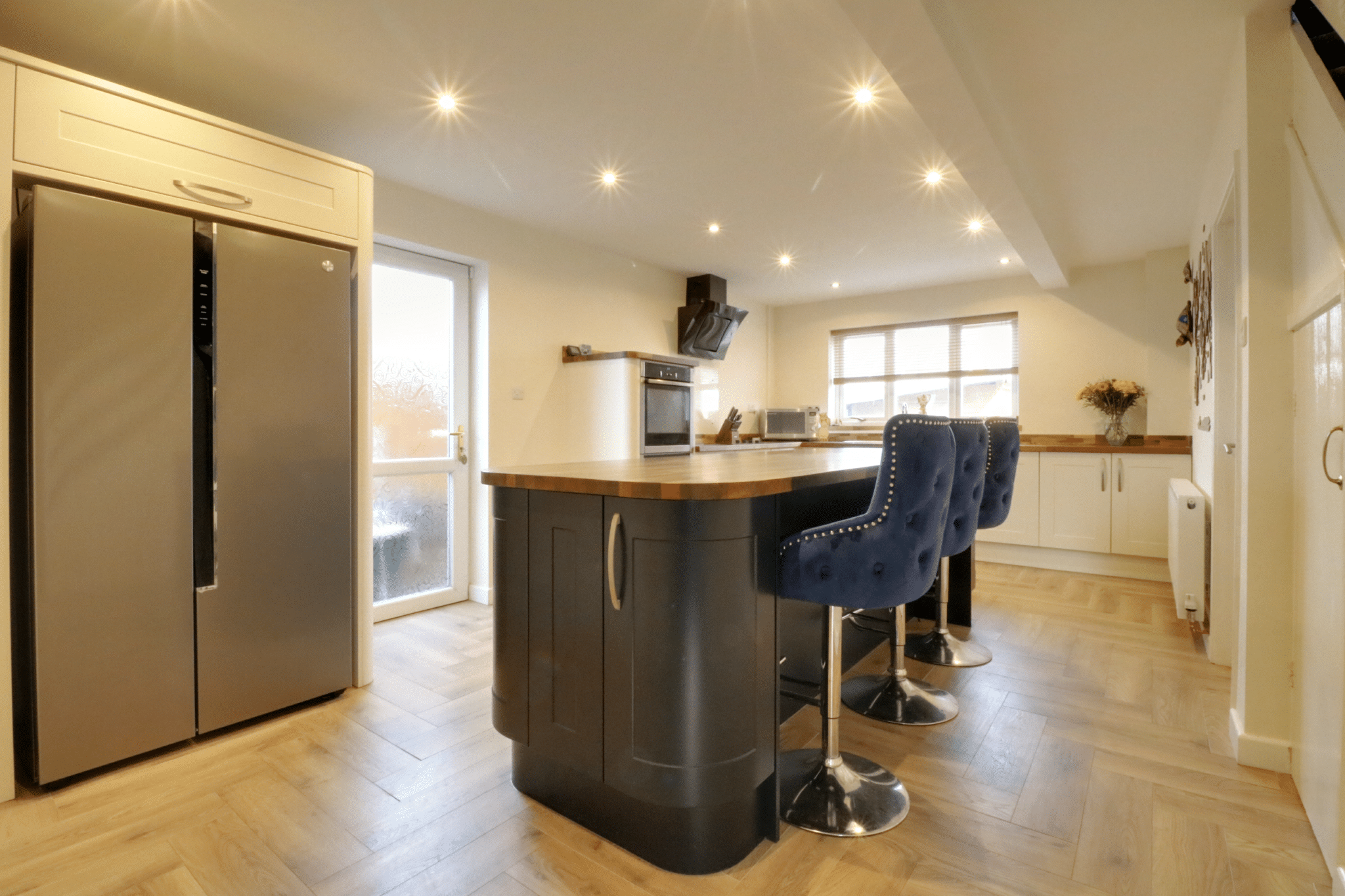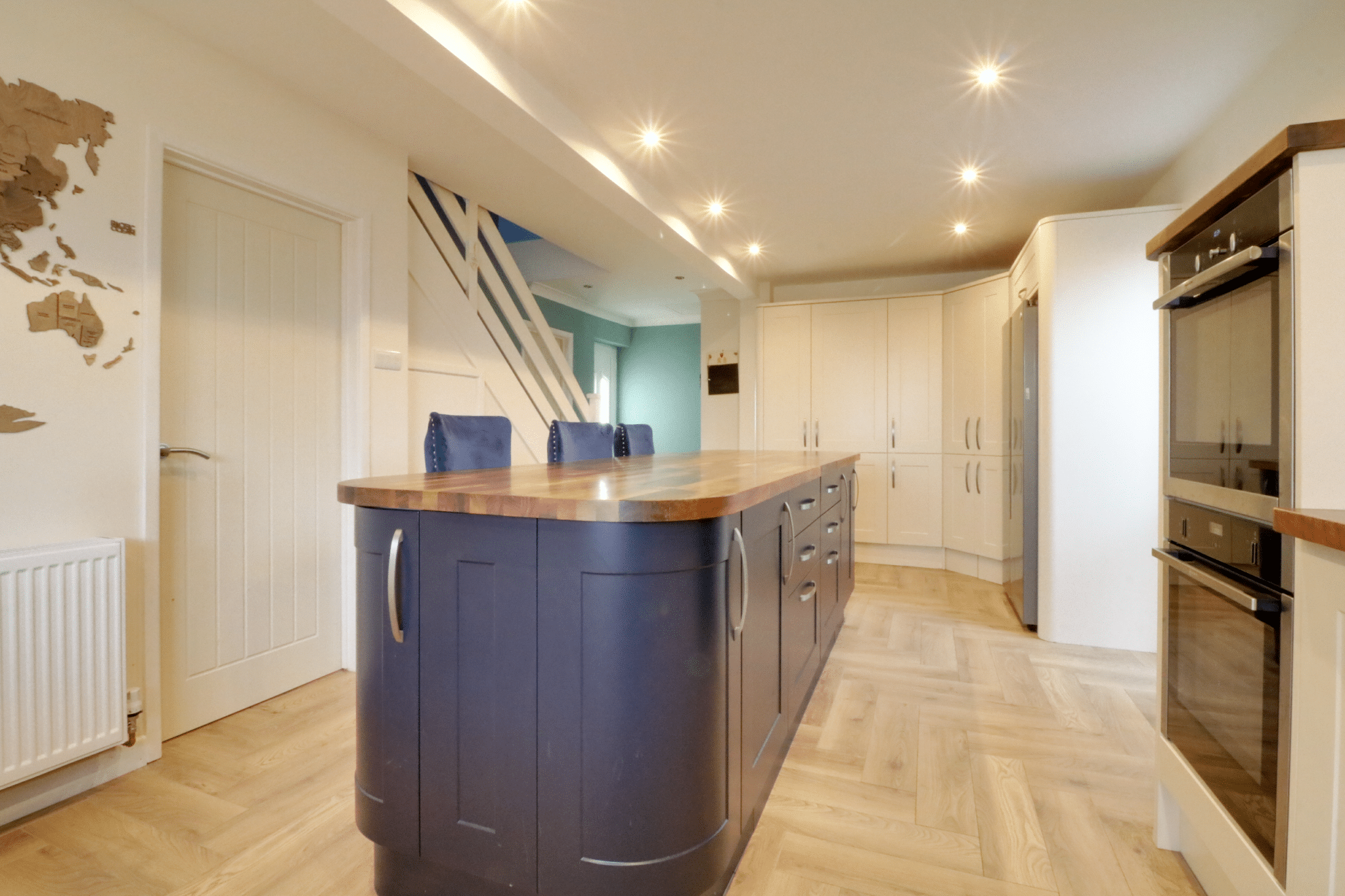 Enjoying a side uPVC double glazed entrance door which allows access to the side of the property. The kitchen enjoys an extensive range of light shaker style low level units, drawer units and wall units with brushed aluminium style pull handles and a butcher block working top surface with matching uprising incorporating a single porcelain sink unit with block mixer tap and drainer to the side, built in four ring electric hob with overhead black canopied extractor fan, double Neff electric oven, further integral appliances including a dishwasher, space for a tall American fridge freezer, matching spacious breakfast island with low level shaker style in dark navy with brushed aluminium style pull handles, continuation of oak style laminate flooring, understairs storage cupboard, modern inset ceiling spotlights and an internal door allows access into the;