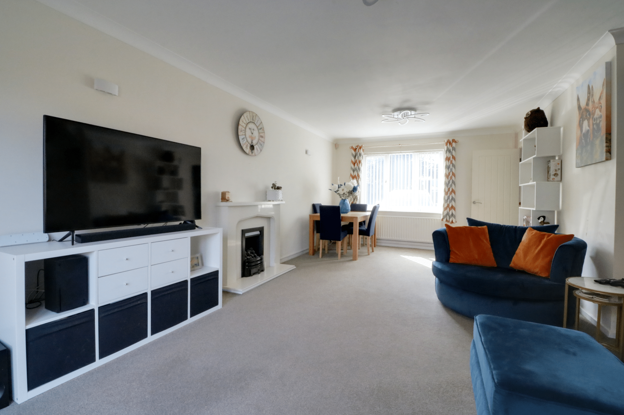 Enjoying a front bay uPVC double glazed window, over the stairs storage cupboard, wall to ceiling coving , oak style laminate flooring and TV input.