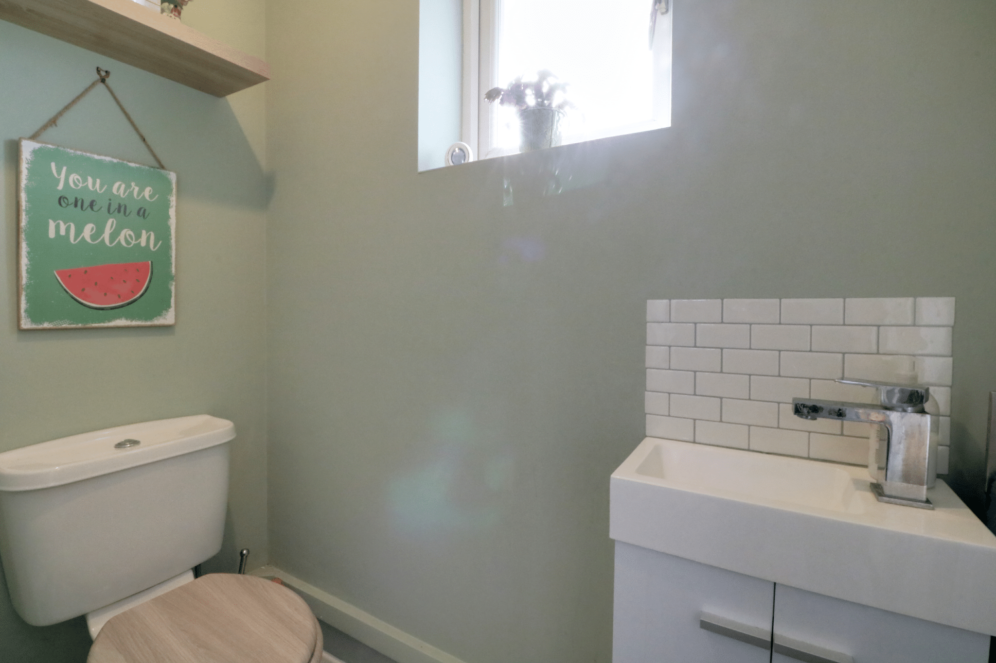 Enjoying a front uPVC double glazed window with frosted glazing and a two piece suite in white comprising a vanity wash hand basin with storage units beneath and tiled splash back, a low flush WC, laminate flooring and wall to ceiling coving.