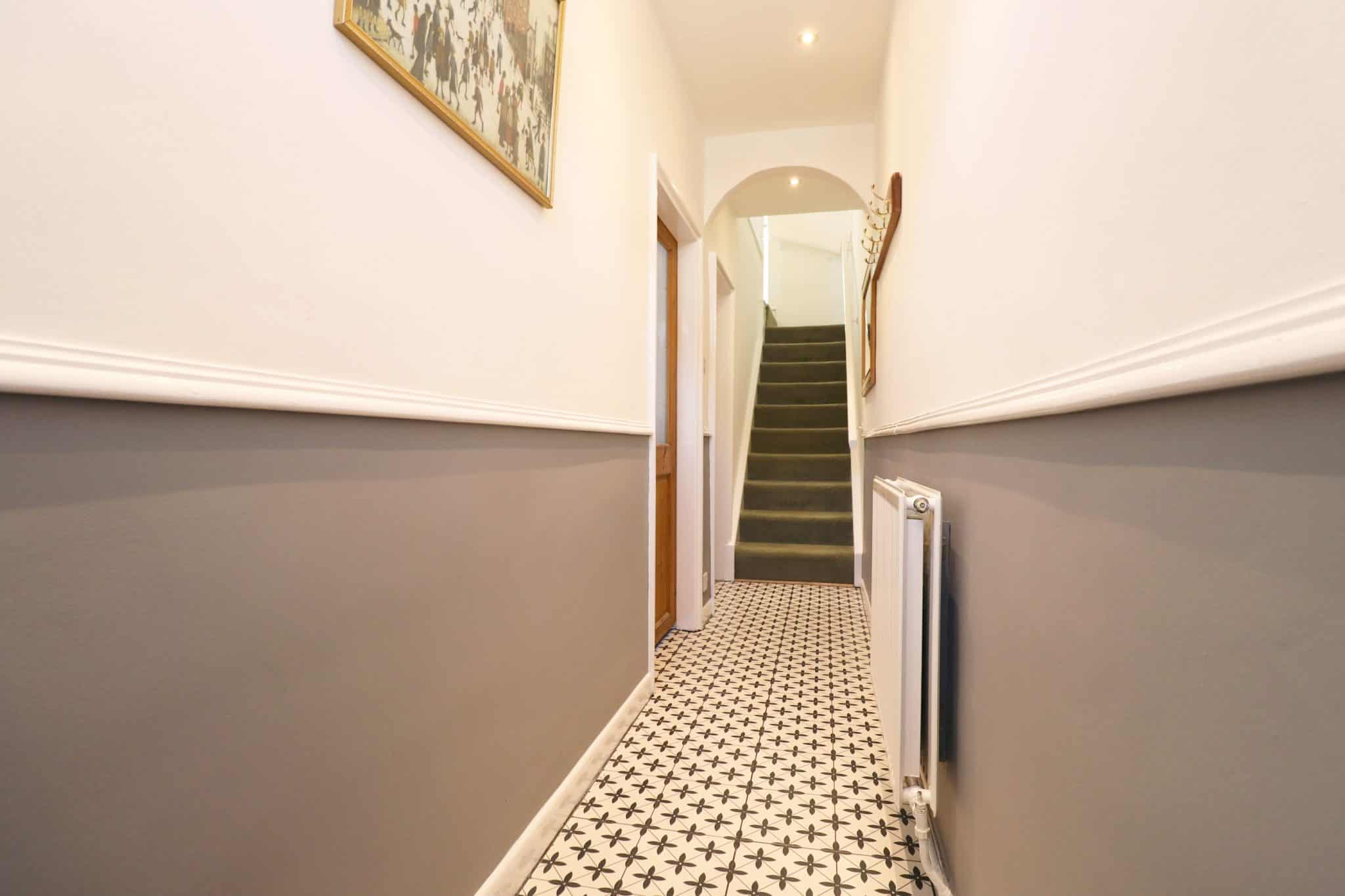 With a traditional four panel hardwood entrance door with single glazed top light, traditional tiled flooring, single flight staircase giving access to the first floor accommodation with grabrail, inset ceiling spotlights and internal solid wood doors giving access into the lounge and dining kitchen.
