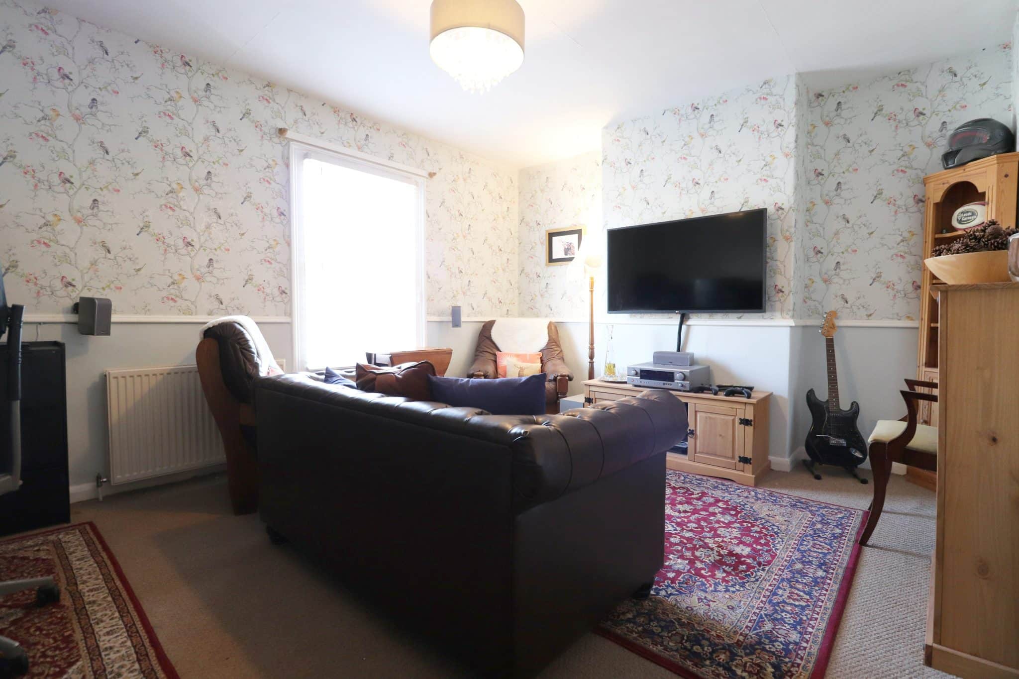 Enjoying front vertical sash window, carpeted floors, multiple electric socket points and TV aerial point.