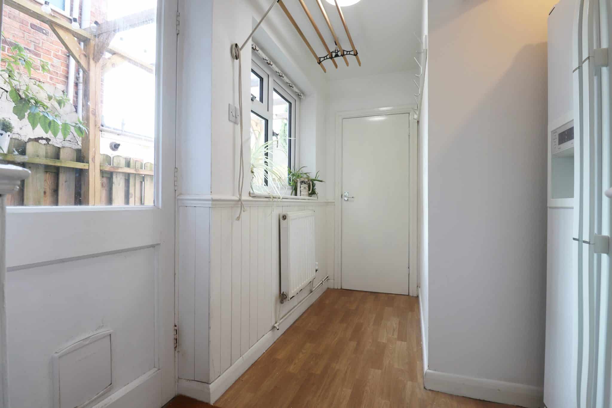 With solid wood entrance door with glass inserts giving access to the rear courtyard and side uPVC double glazed window, wood vinyl flooring, a recessed wall and an internal door allowing access to;