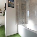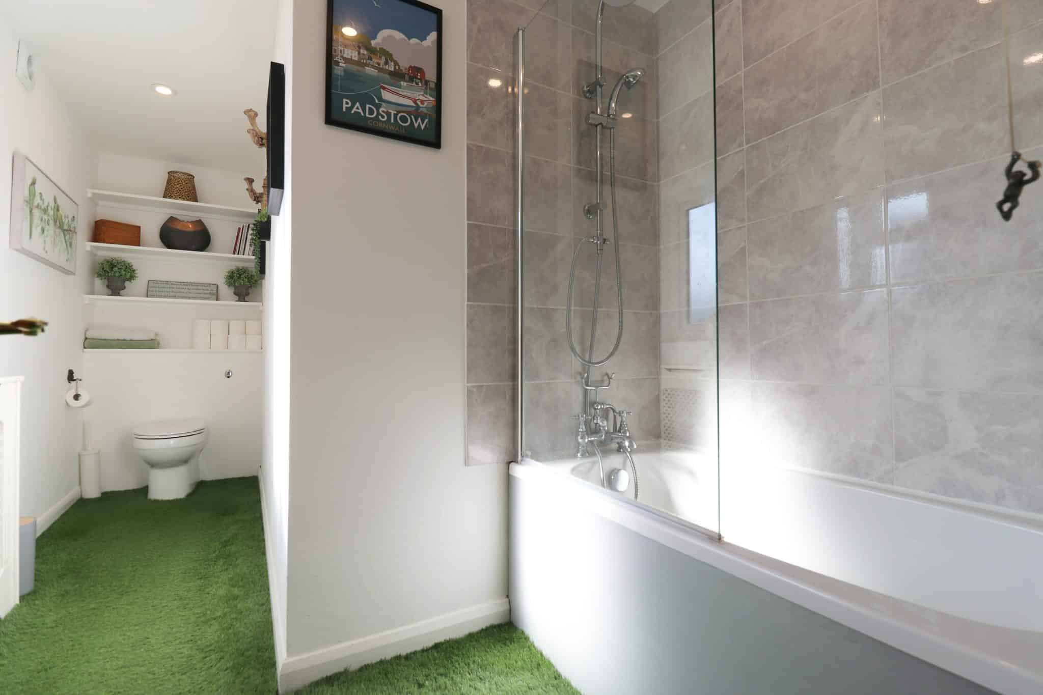 With a side obscured uPVC double glazed window, three piece suite in white comprising a low flush WC, panelled bath with overhead shower attachment with an attractive tiled finish and wash hand basin with tiled splash back, astroturf flooring, ceiling mounted spotlights and built-in shelving above the toilet.
