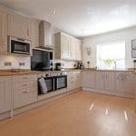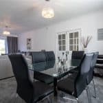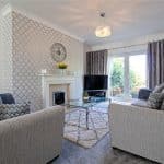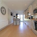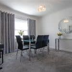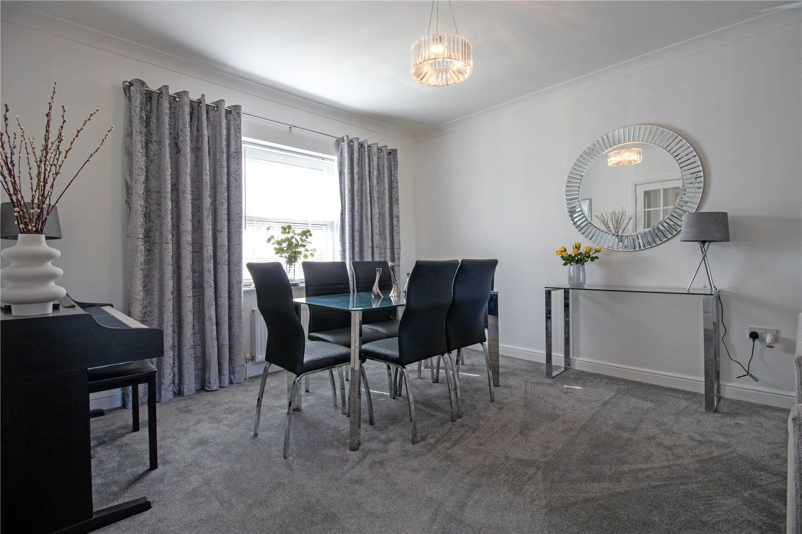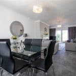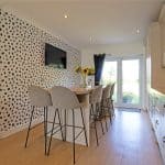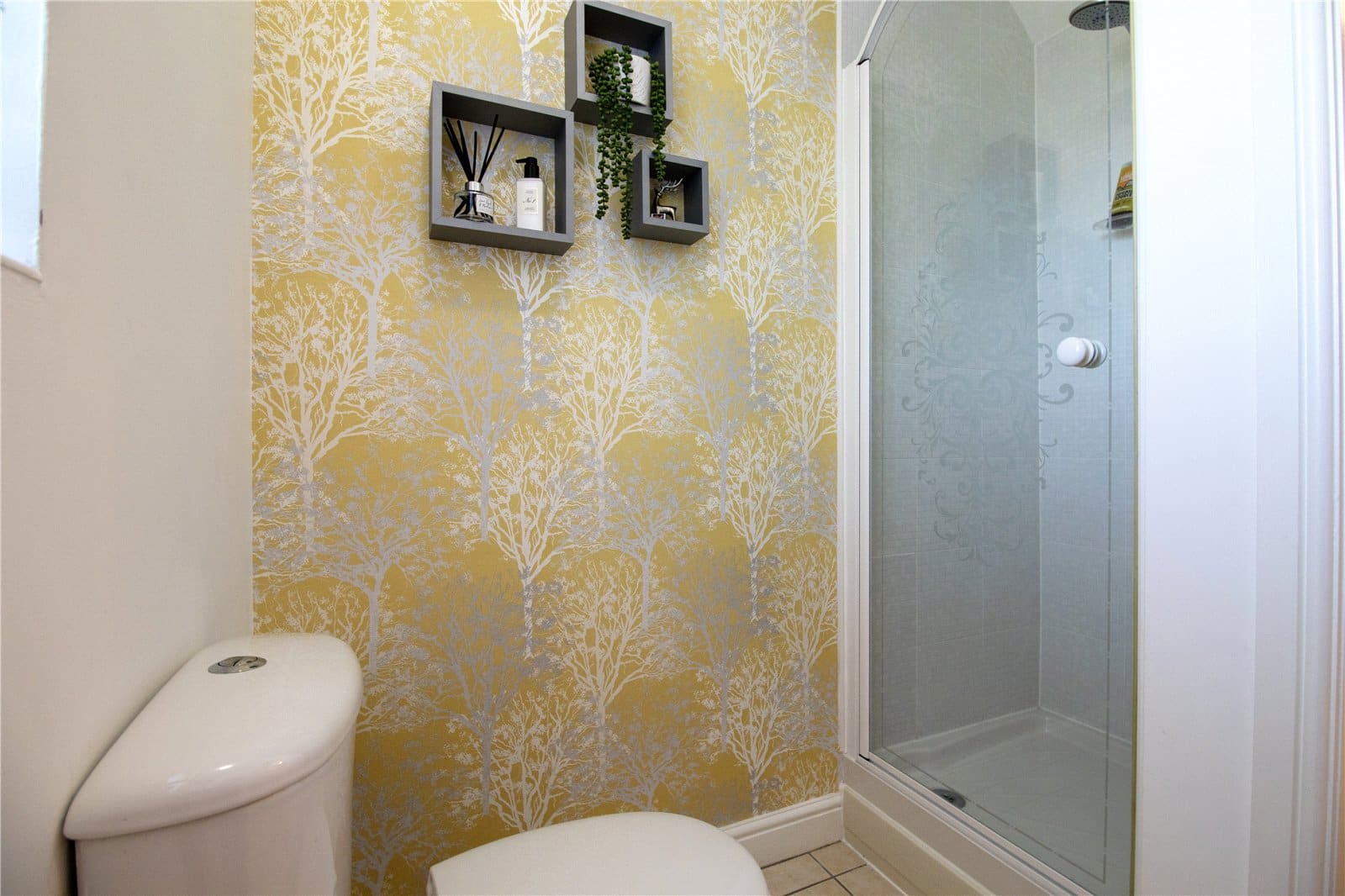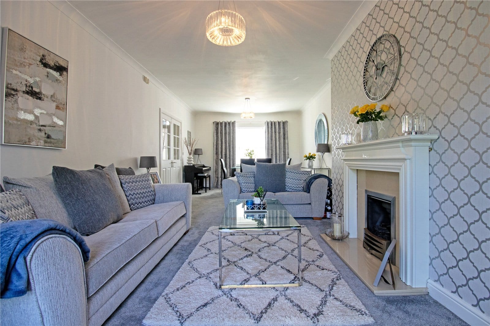 The ground floor of the home is introduced by a welcoming entrance hall with a useful coat cupboard leading into a generous hallway. To one side sits a spacious lounge-diner with dual-aspect views and a feature gas fireplace, while to the other lies a stylish modern dining kitchen fitted with integrated appliances including a dishwasher, fridge-freezer, microwave, double oven, and five-ring induction hob. A contemporary shower room completes this level.