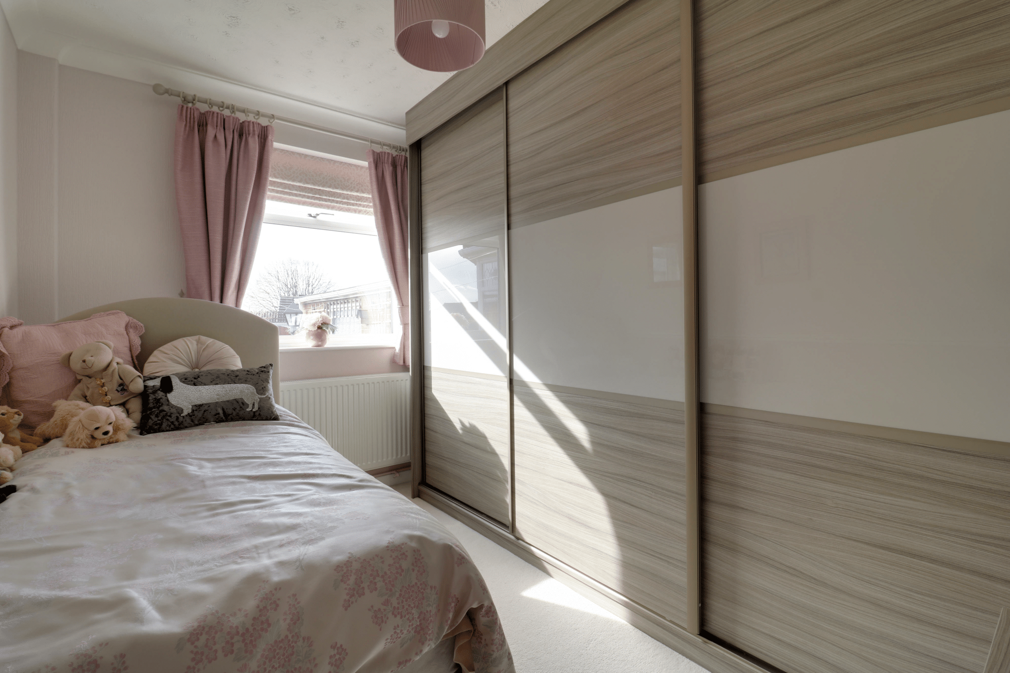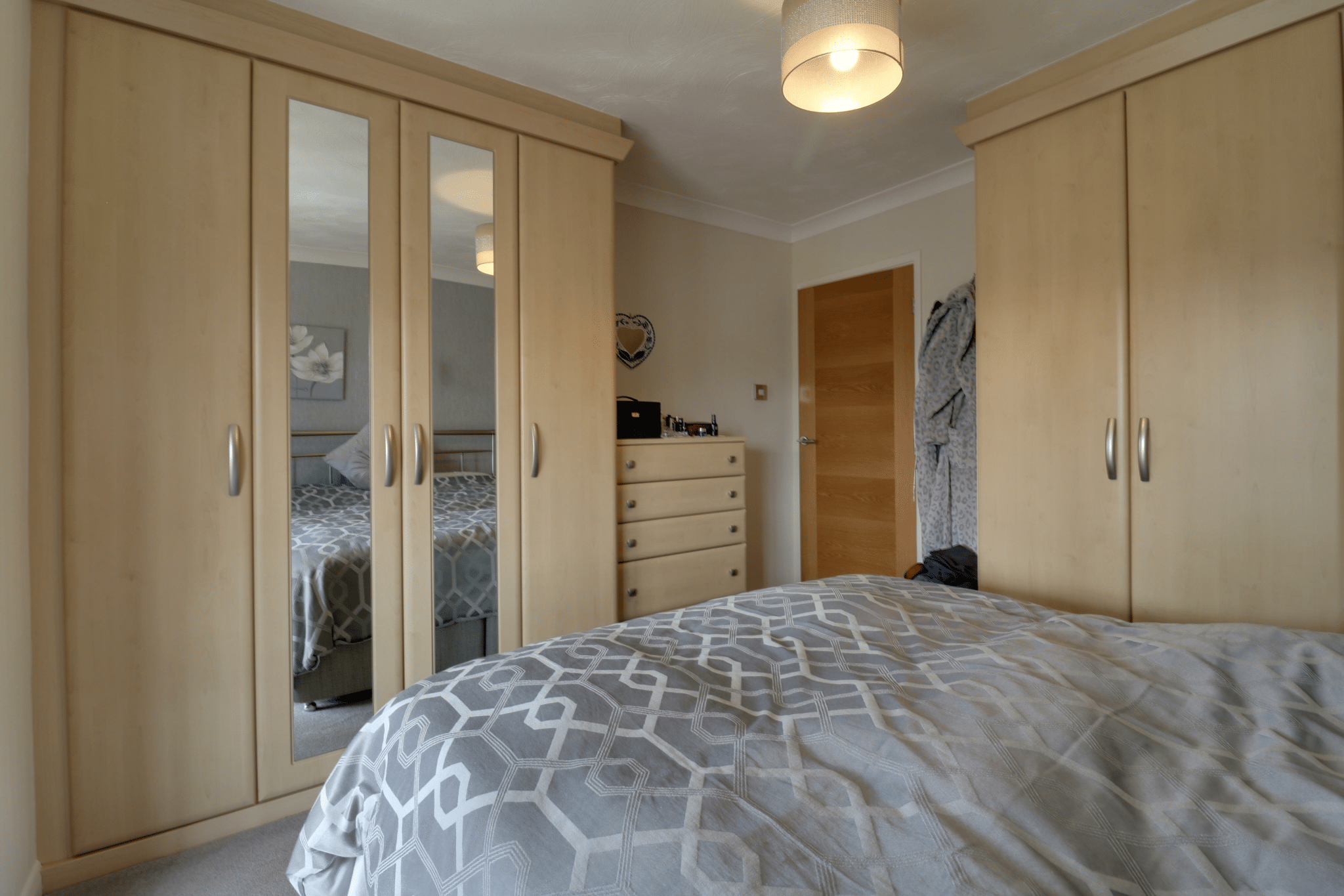 Has a rear uPVC double glazed window, dado railing, wall to ceiling coving and a bank of attractive style fitting wardrobes with sliding doors.