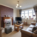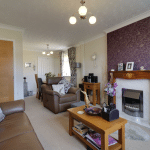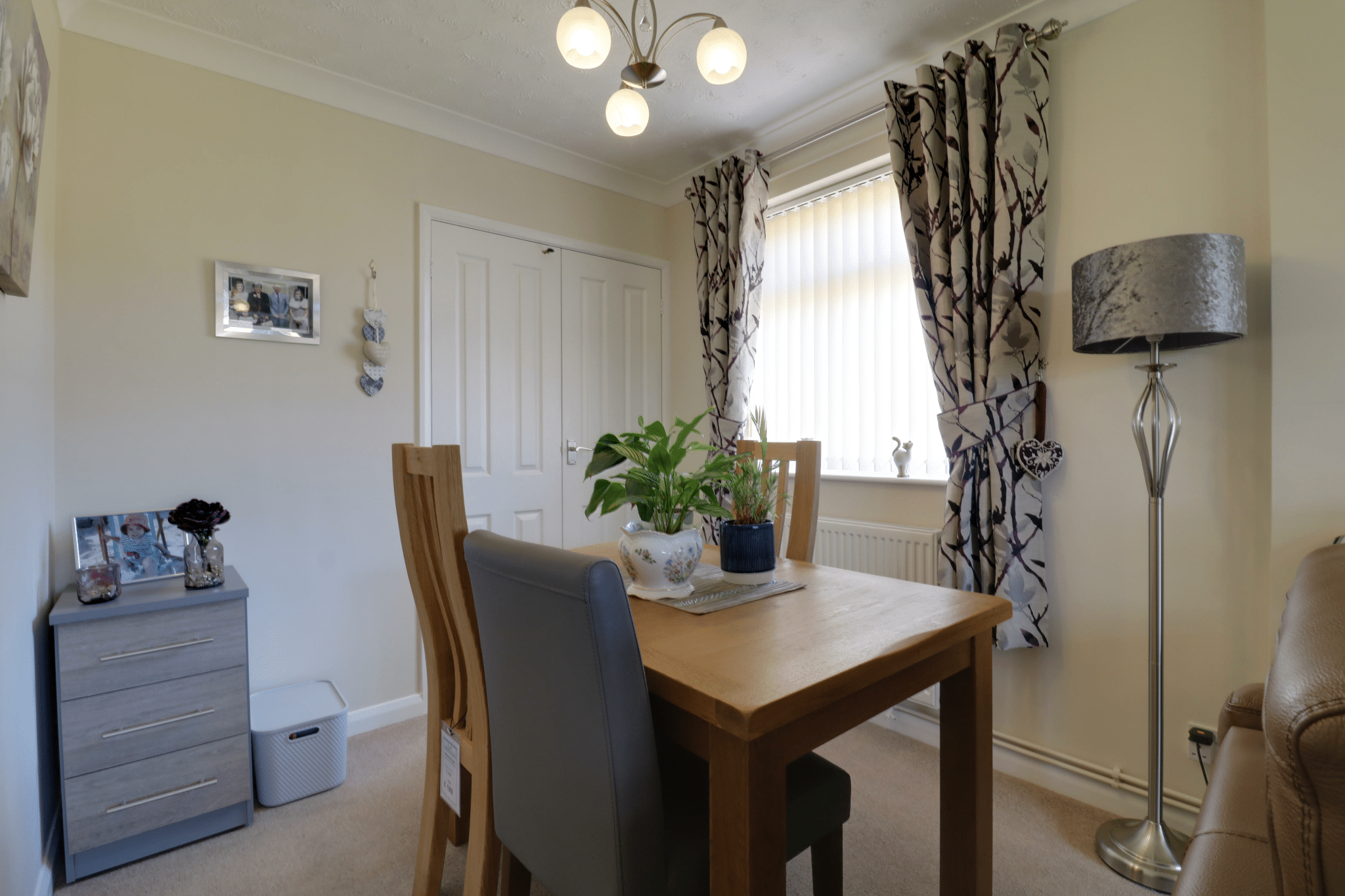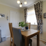 With a front bay uPVC double glazed window, a pebbled effect electric fireplace with marbled style hearth and backing with oak surrounding mantel, TV input and an opening leads through to the dining area which has a side uPVC double glazed and fitted storage cupboards.
