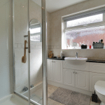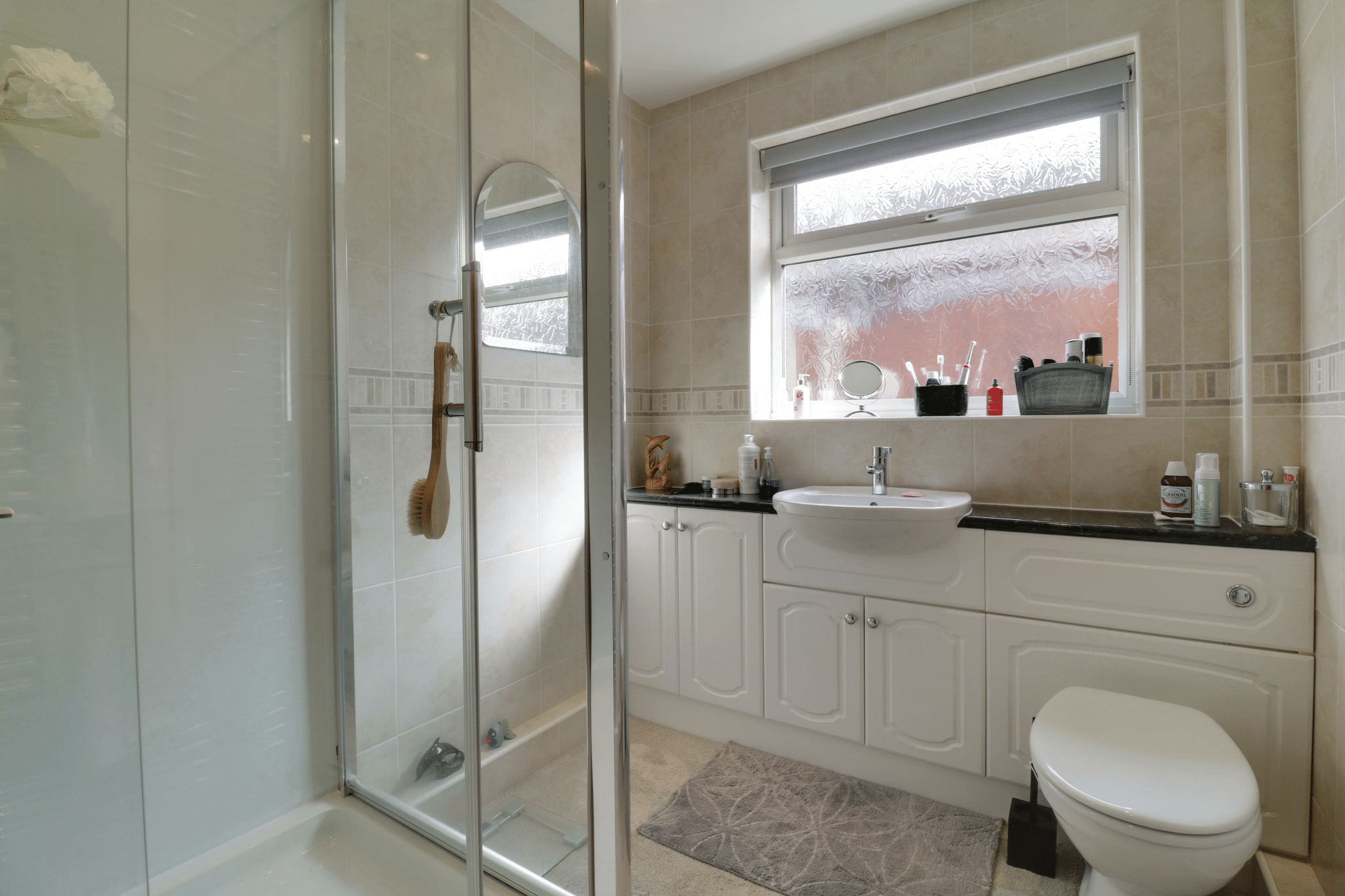 With a side uPVC double glazed window with frosted glazing and a three piece suite comprising a double walk-in shower cubicle with overhead Triton Mira electric shower with mermaid boarding splash back and glazed sliding door and screen, an oval wash hand basin with storage units beneath with a patterned working top with adjoining low flush WC, fully tiled walls, chrome wall mounted towel heater, inset ceiling spotlights and extractor fan.