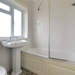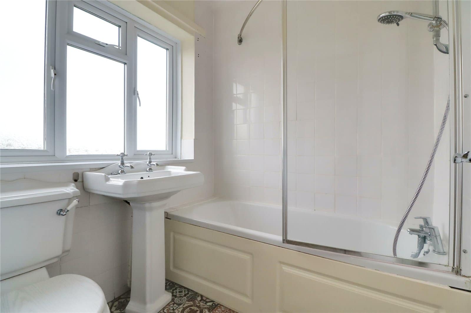 With front uPVC double glazed window with patterned glazing providing a traditional suite in white comprising low flush WC, pedestal wash hand basin and panelled bath with shower attachments and glazed screen, tiled flooring and part tiling to walls.