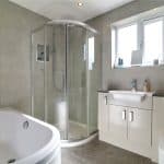 With a front uPVC double glazed window with frosted glazing providing a four piece suite comprising a panelled bath, a corner walk-in shower cubicle with overhead chrome main shower and curved twin glazed screens, a vanity wash hand basin with gloss storage units below and adjoining low flush WC, fully tiled walls, fully tiled flooring, wall mounted chrome towel heater and inset ceiling spotlights.