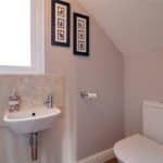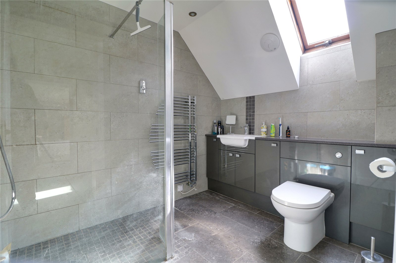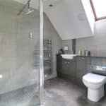 With a front Velux skylight and a three piece suite comprising a double walk-in shower cubicle with overhead chrome main shower with tiled splash backs and glazed screen, vanity wash hand basin with storage units beneath and adjoining low flush WC with a quartz style working top, tiled flooring and walls, inset ceiling spotlights, a wall mounted chrome towel heater and underfloor heating.