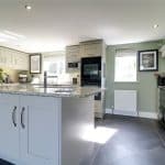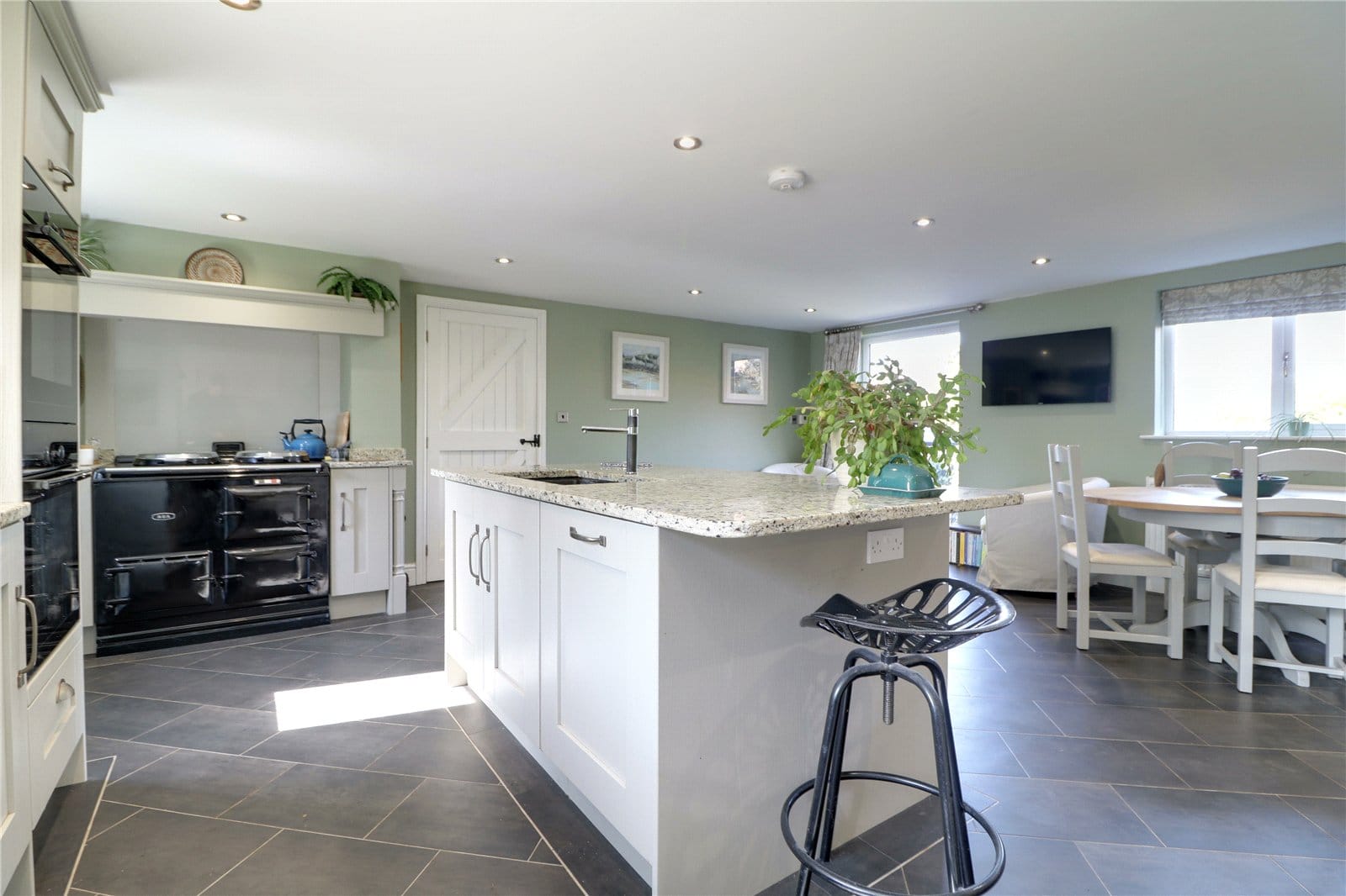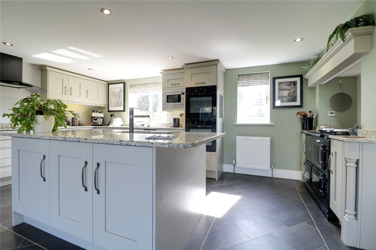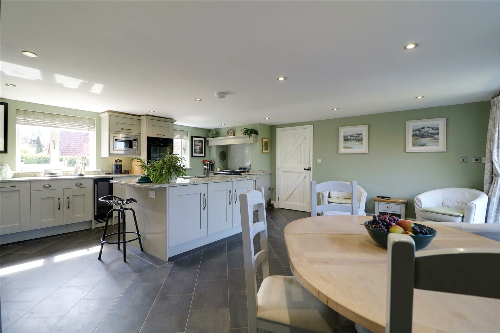 Including a dual aspect with front and rear uPVC double glazed windows. The kitchen includes an extensive range of light shaker style low level units, drawer units and wall units with brushed aluminium style pull handles and solid granite working top surfaces with matching uprising incorporating a double inset sink unit with block mixer tap and drainer to the side, range of integral appliances which includes a Neff double open, integrated microwave, wine fridge, plumbing for a dishwasher, five ring Neff induction hob with overhead canopied extractor fan with downlighting and splash back, space for a freestanding Aga, inset modern ceiling spotlights, Amtico flooring, separate central breakfasting island integral fridge freezer and a barn style door allowing access to;