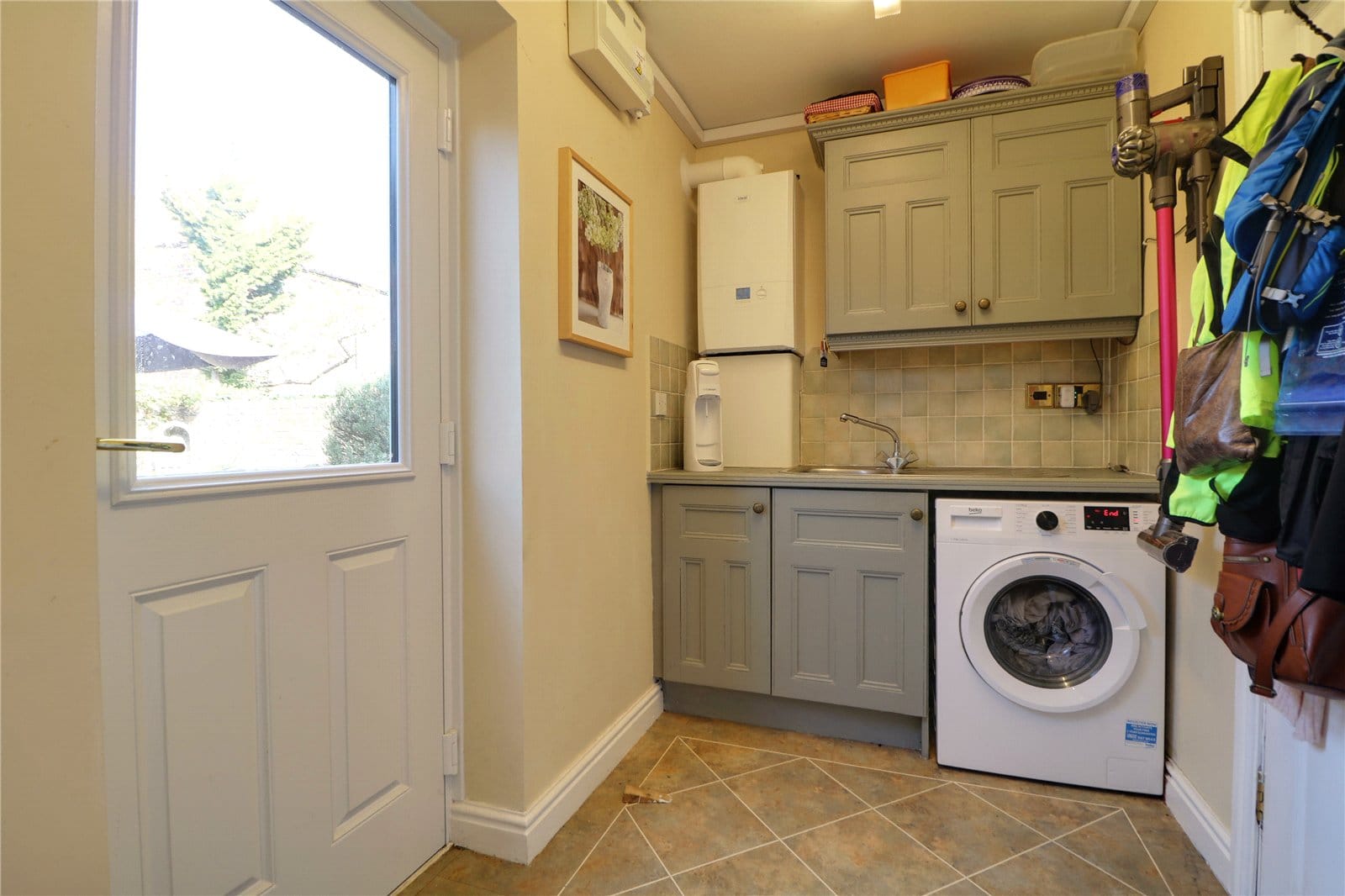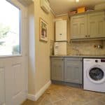 With a rear composite entrance door with double glazing and working top surface with plumbing for a washing machine, wall mounted modern Ideal gas combi boiler, single stainless steel sink with further low level and high level storage units and an internal door allows access to the double garage.