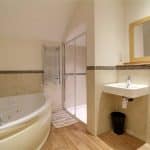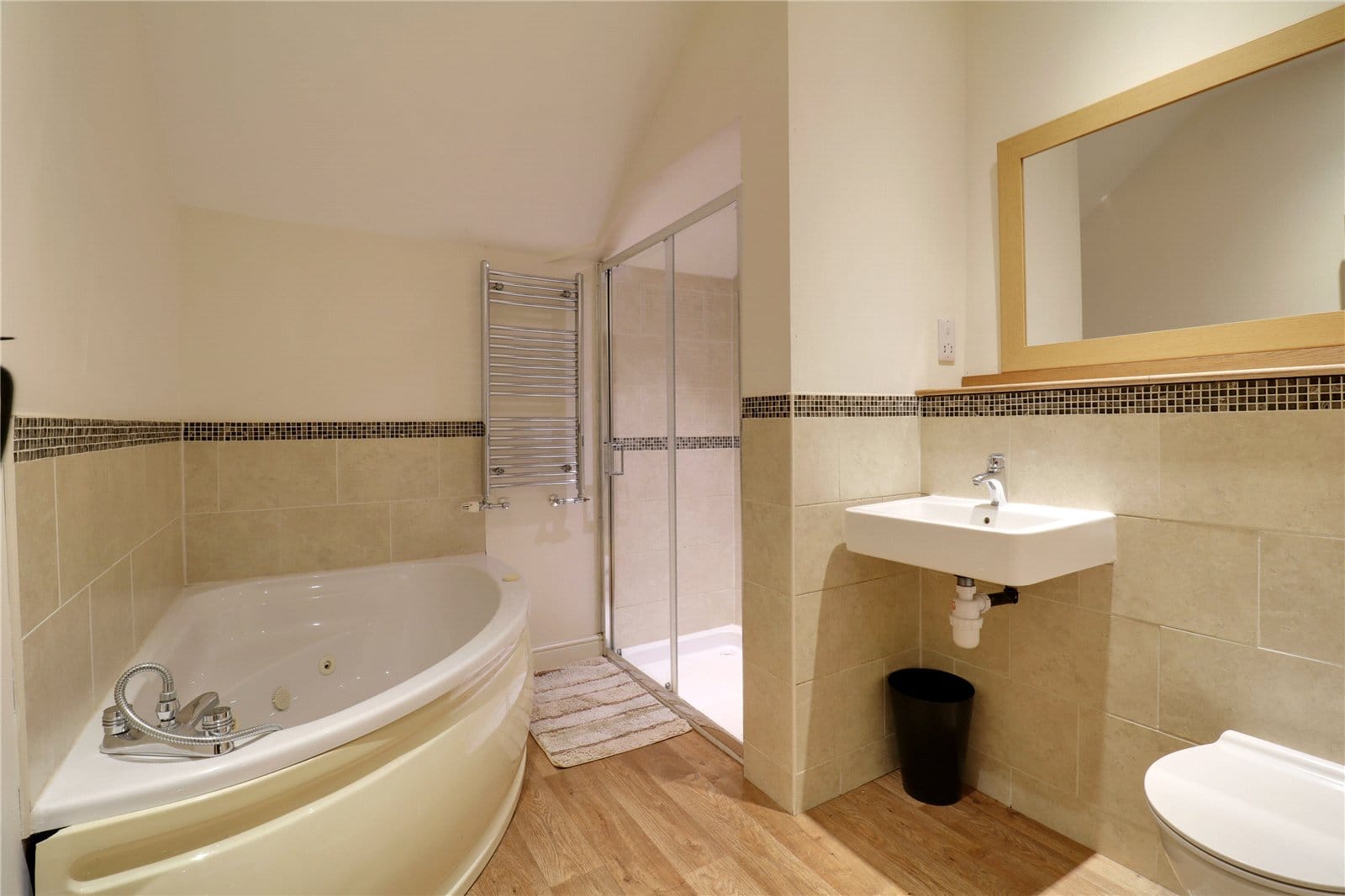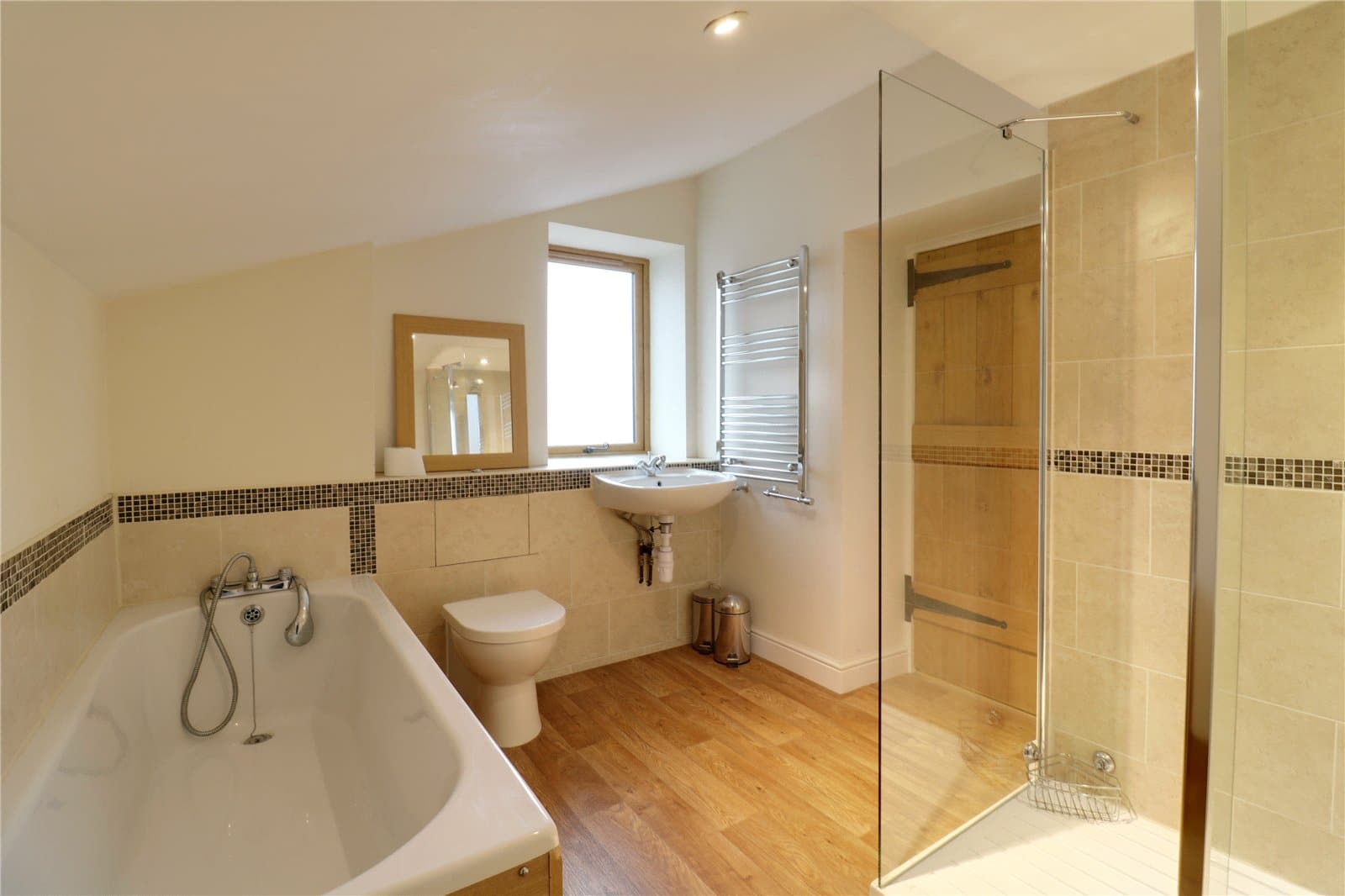 With a four piece suite comprising a walk-in double shower cubicle with sliding glazed doors, overhead chrome mains shower and tiled splash backs, inset ceiling spotlights, wall mounted rectangular wash hand basin with adjoining low flush WC with partly tiled walls with oak top, corner panelled uPVC bath with block mixer tap, partly tiled walls, inset ceiling spotlights, chrome wall mounted towel heater and oak style vinyl flooring.