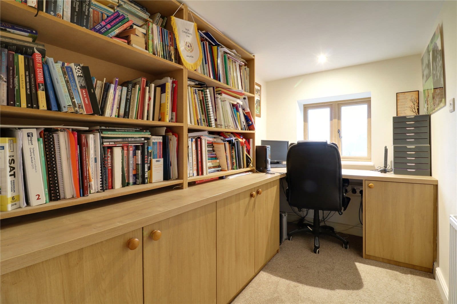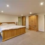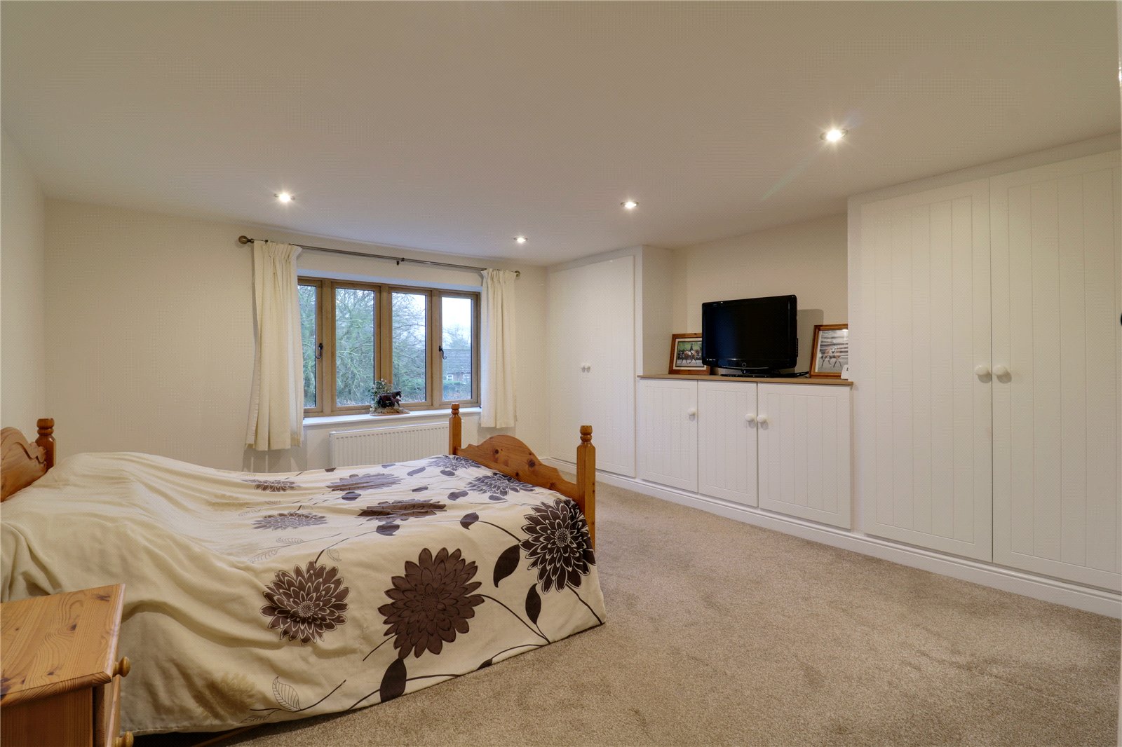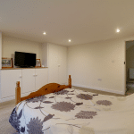 Has a front uPVC double glazed woodgrain effect window, inset ceiling spotlights, TV input and twin built-in storage cupboards with central low level unit cupboards.