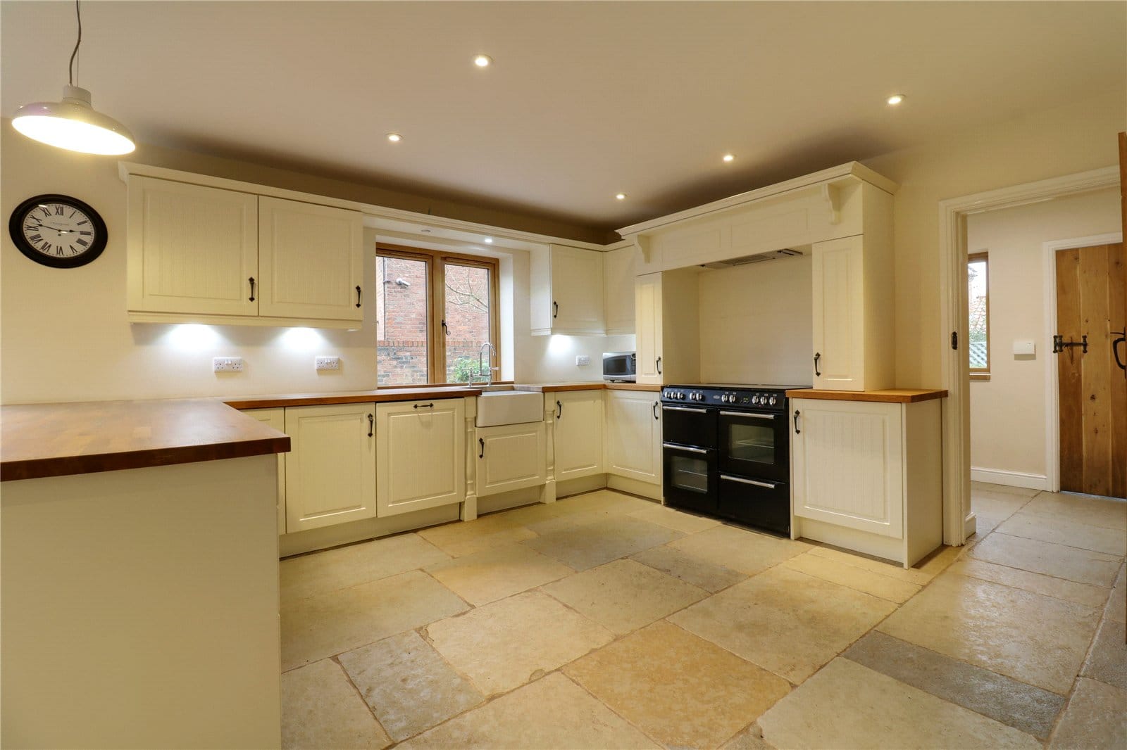 With surrounding uPVC double glazed windows and continuation of tiled flooring, inset ceiling spotlights. The kitchen includes a range of light shaker style low level units, drawer units and wall units with stylish brushed aluminium style pull handles and solid wood working top surfaces incorporating a single Belfast sink bowl unit with block mixer tap and drainer to the side, space for a free standing Belling gas double oven with grill and overhead extractor fan and inset ceiling spotlights, downlighting to the high level units, integral fridge, plumbing for a dishwasher and a barn style door allows access off to;