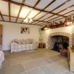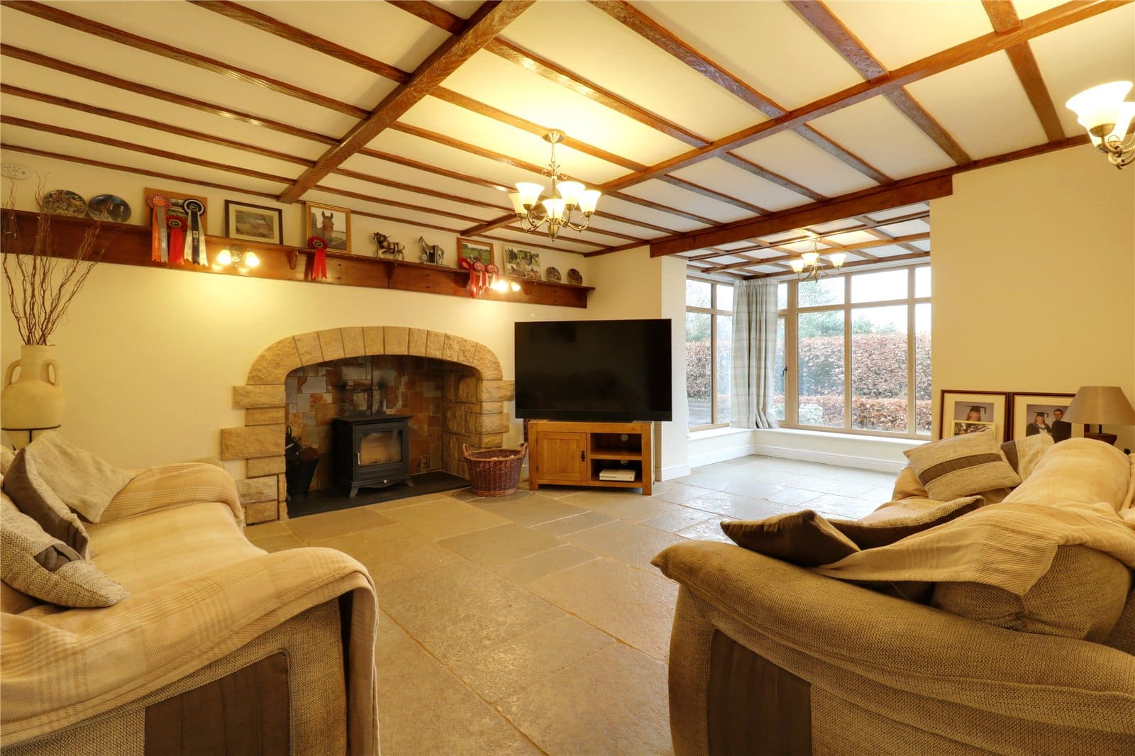 With a front bay wood grain effect double glazed windows, decorative beams to the ceiling, picture railing, continuation of tiled flooring, three double wall lights and a feature recessed tiled fireplace with multi burning fire stove with slate tiled hearth and TV input.