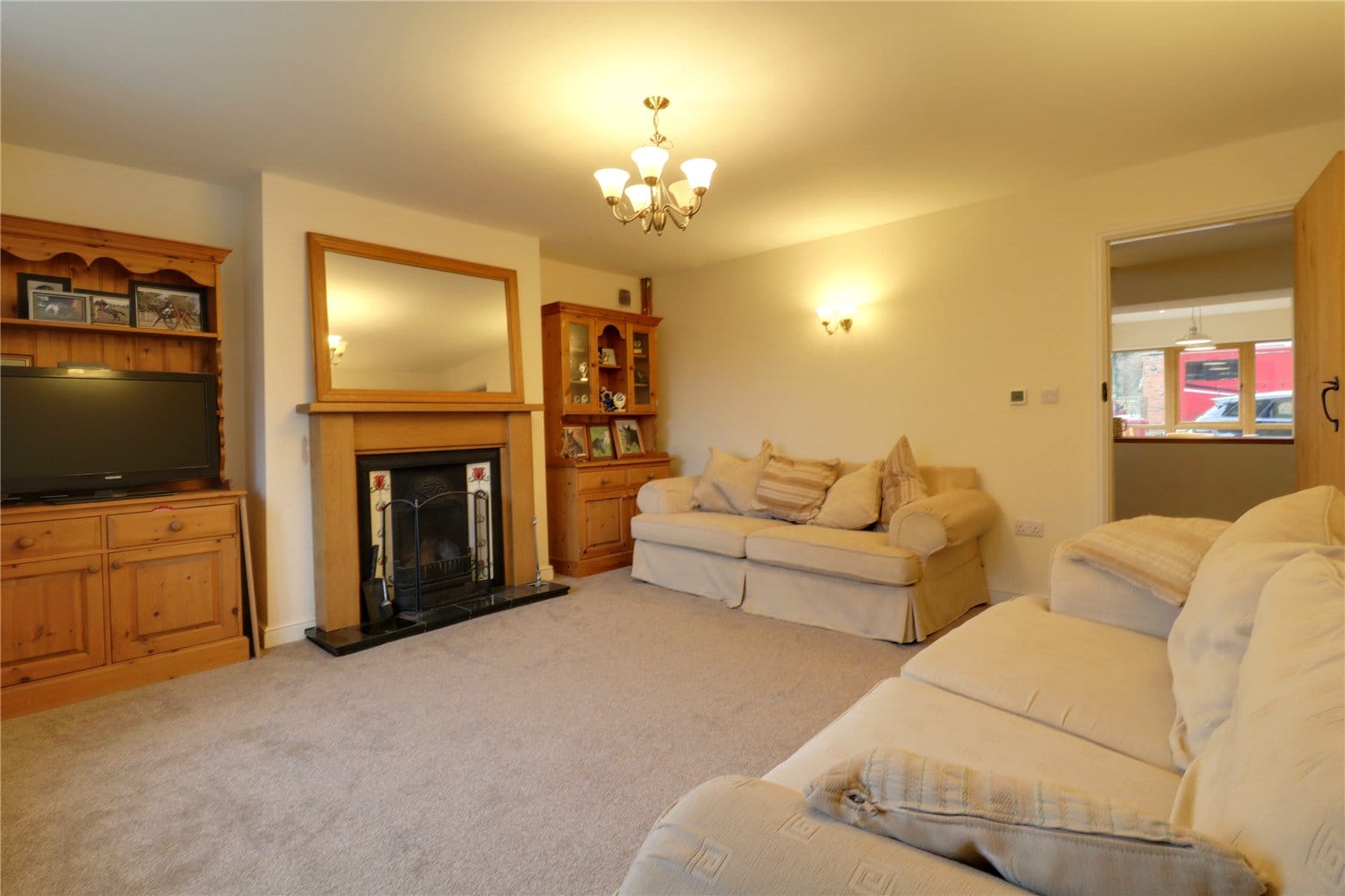 With a front woodgrain effect uPVC double glazed window, a Victorian style open fireplace with oak surround and mantel with marbled style tiled hearth, TV input and two double wall lights.